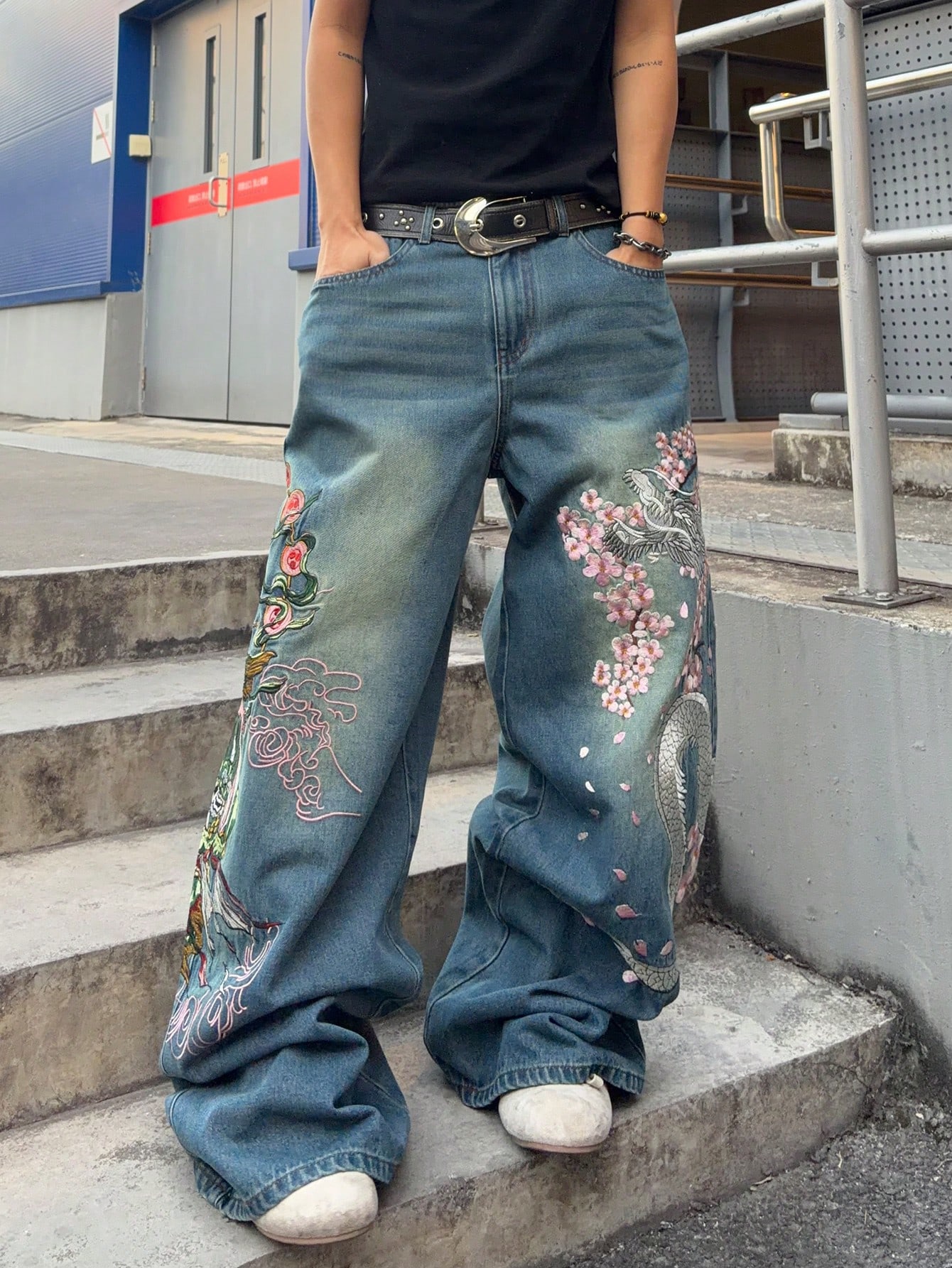 Jeans larghi con vestibilità ampia e ricamo di mostri sulla tasca, per uomo