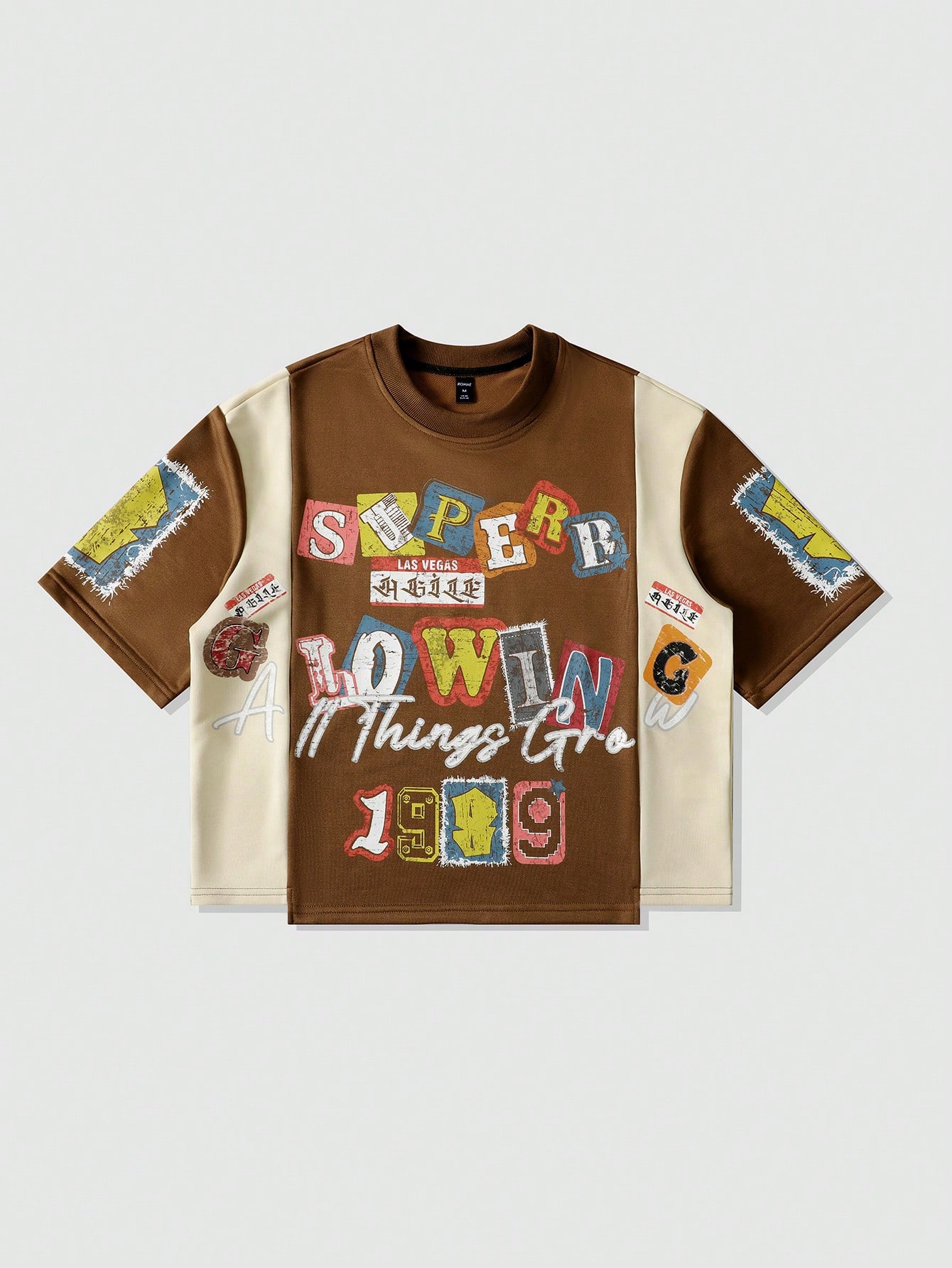 maglietta da uomo con stampa patchwork, stile oversize corto, stile retrò da strada