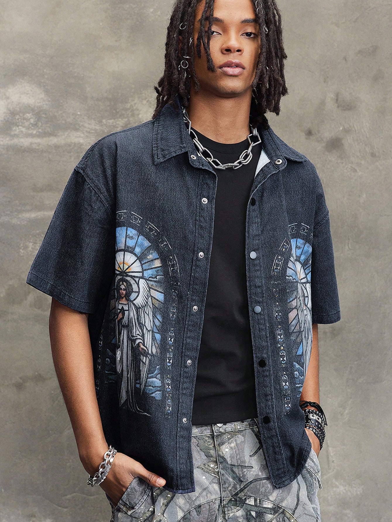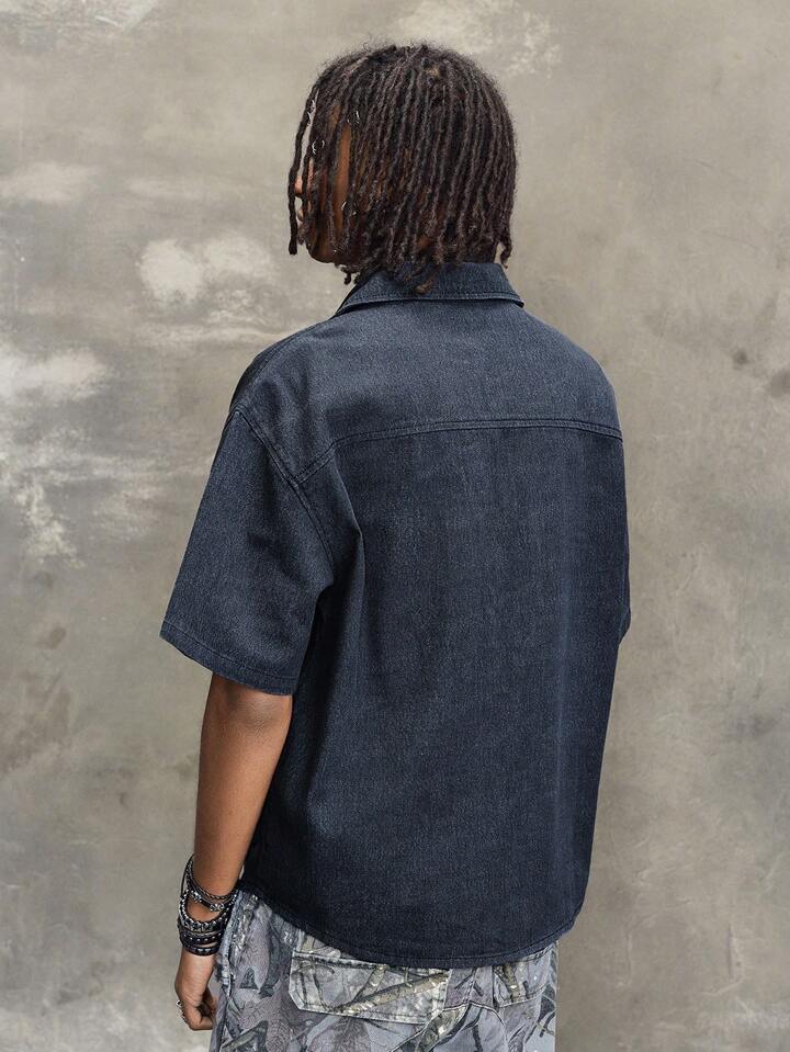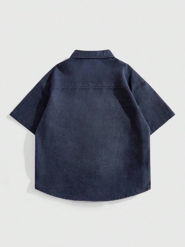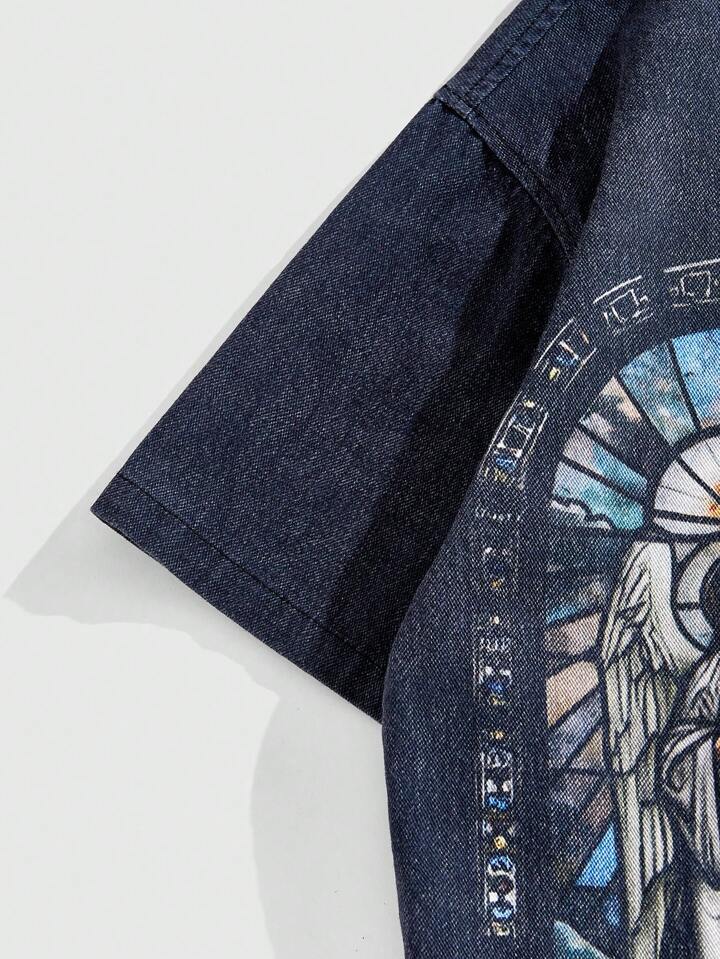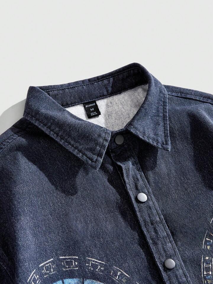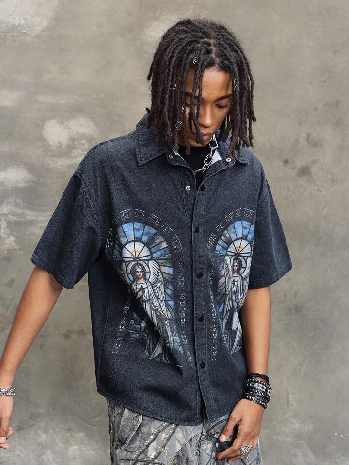 Camicia a maniche corte in denim con stampa, stile casual da uomo