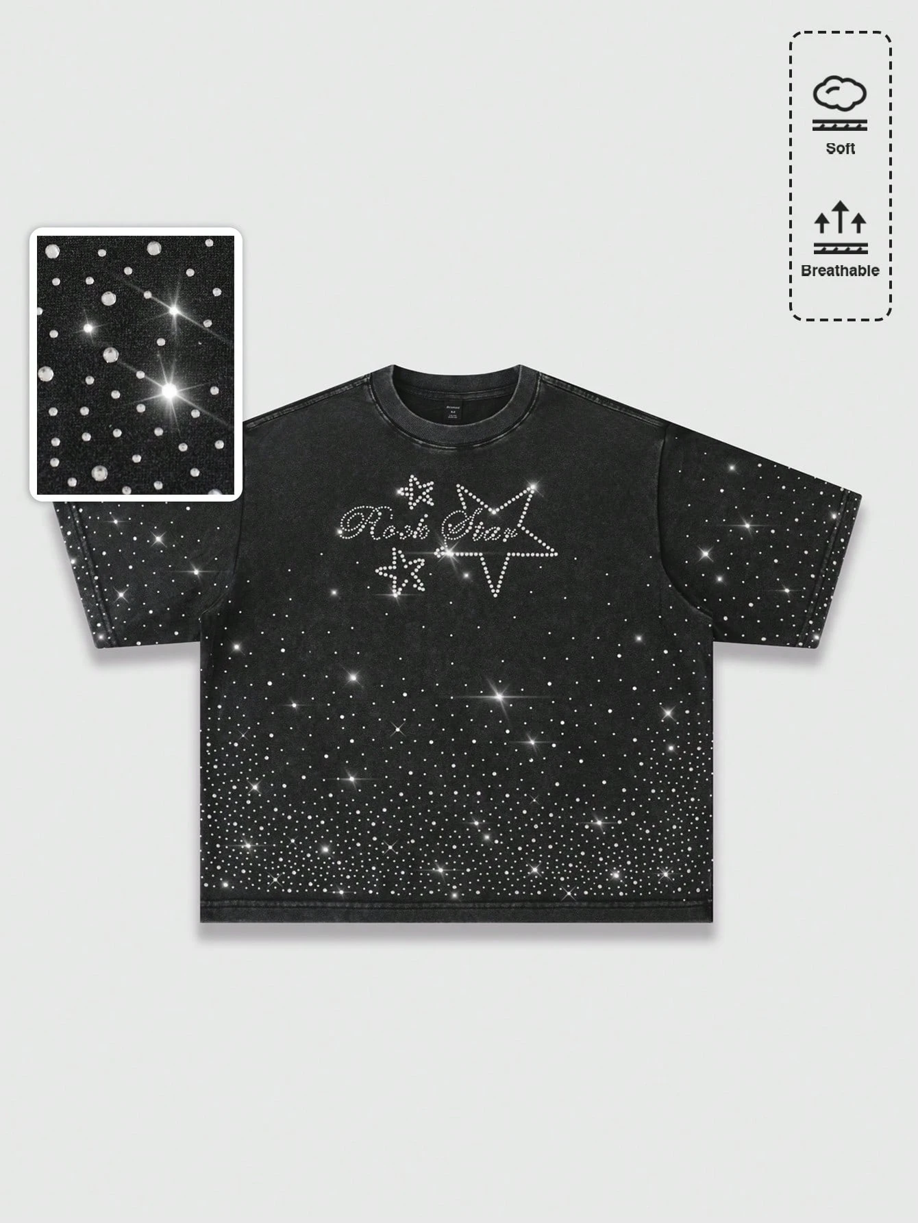 T-shirt casual da uomo a girocollo con maniche corte, lavata, con stelle di strass