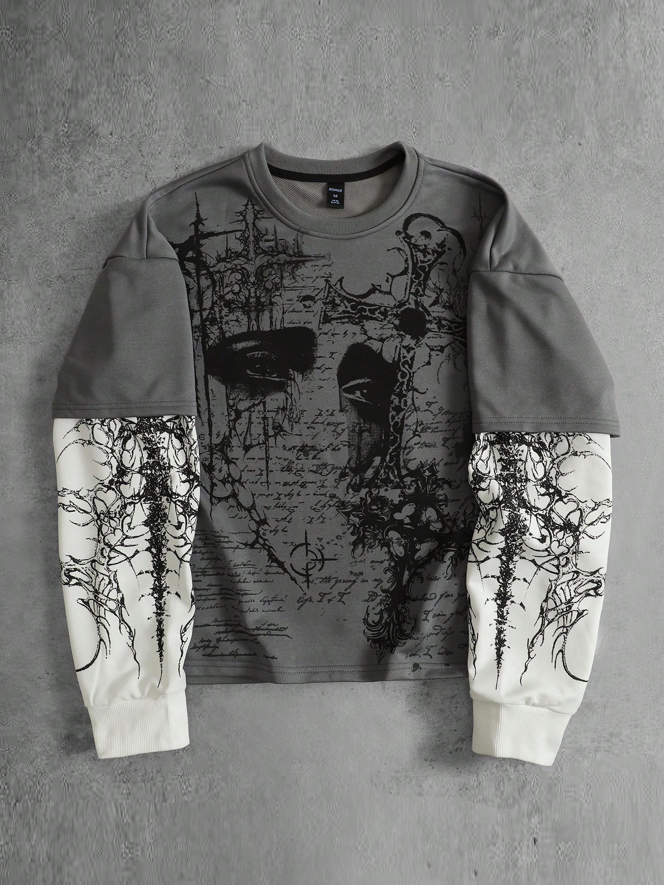 Maglietta a maniche lunghe da uomo con scollo rotondo, stampa a croce, effetto patchwork, casual e versatile per uso quotidiano
