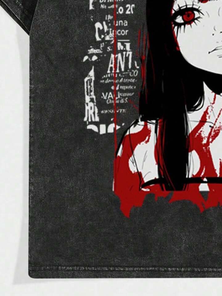 Maglietta da uomo a manica corta con stampa di personaggi anime, Maglietta con effetto lavato 'distressed', stile vintage per abbigliamento streetwear