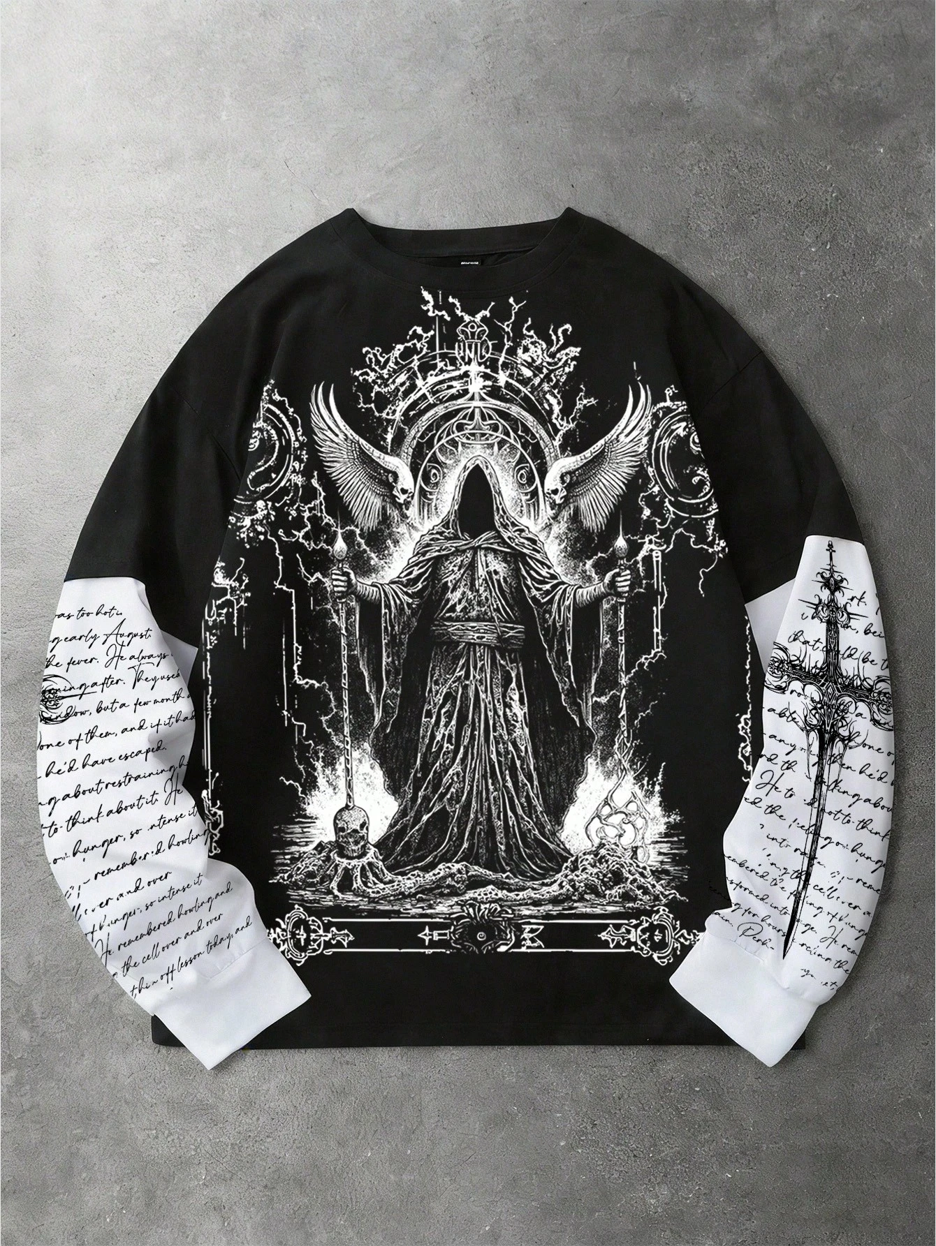 Maglietta casual da uomo a girocollo, manica lunga, con stampa di slogan e ali
