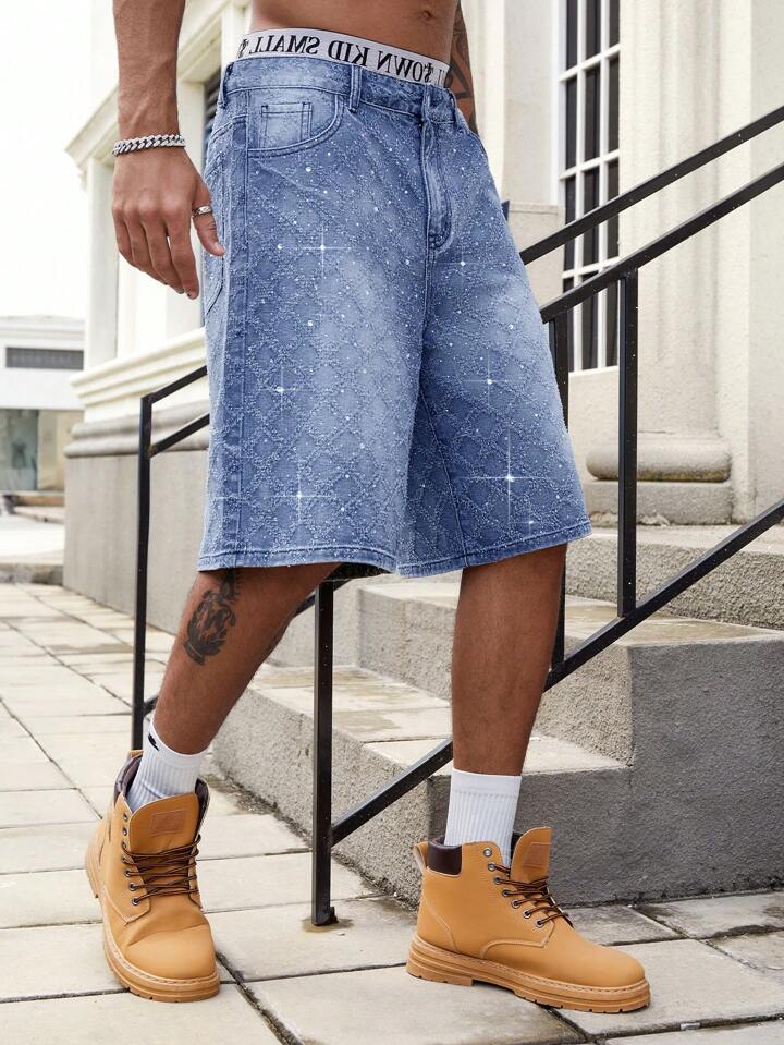 Street Life Pantaloncini di jeans estivi ampi e comodi da uomo con decorazioni in strass sulla tasca