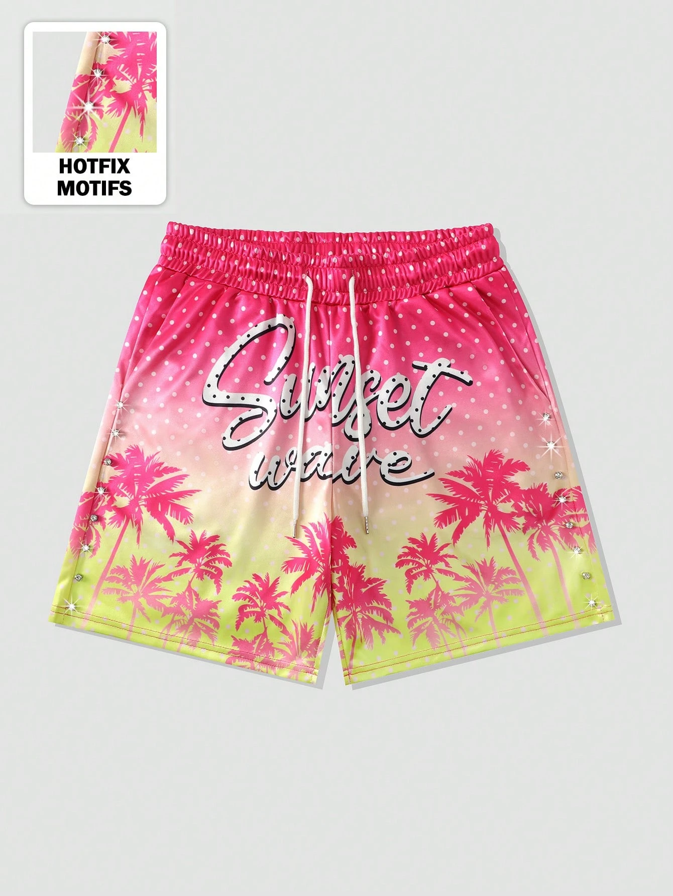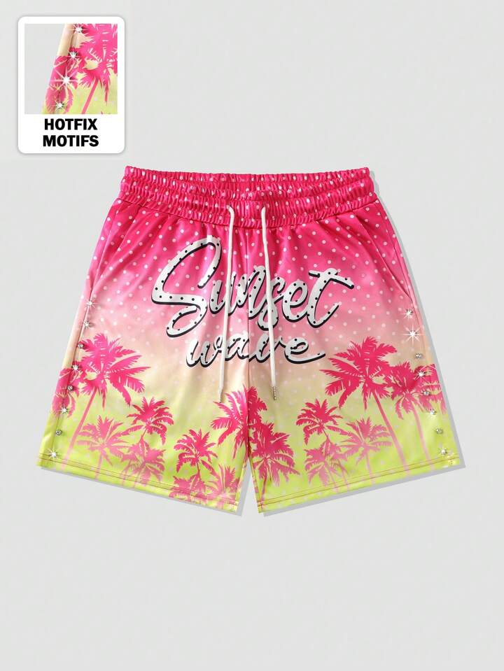 Pantaloncini da spiaggia casual da uomo con stampa di palme e decorati con diamanti scintillanti