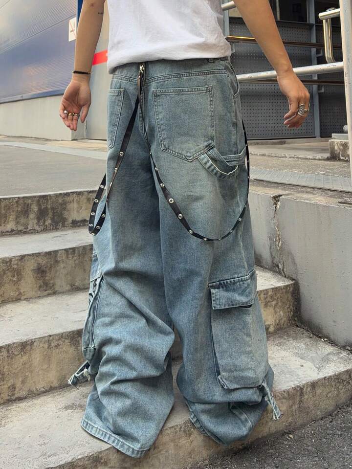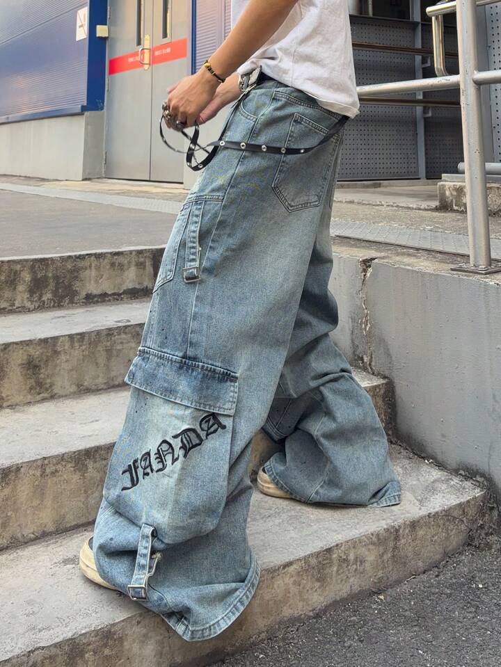 Jeans cargo con vestibilità ampia, lavati e consumati, con ricamo di lettere per uomo