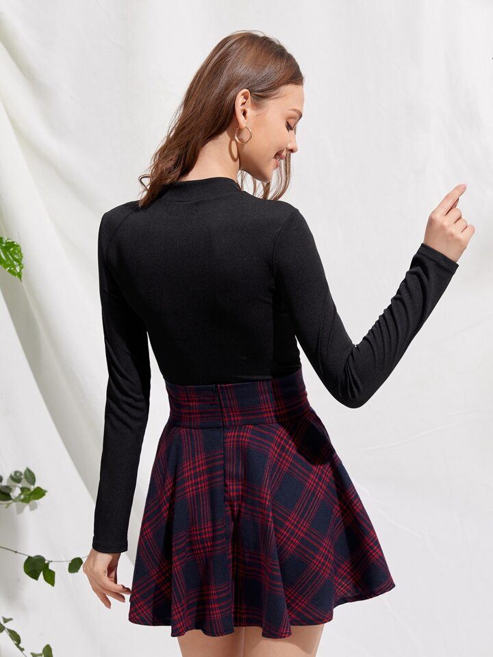Maglietta monocolore con collo dritto e Gonna a quadri