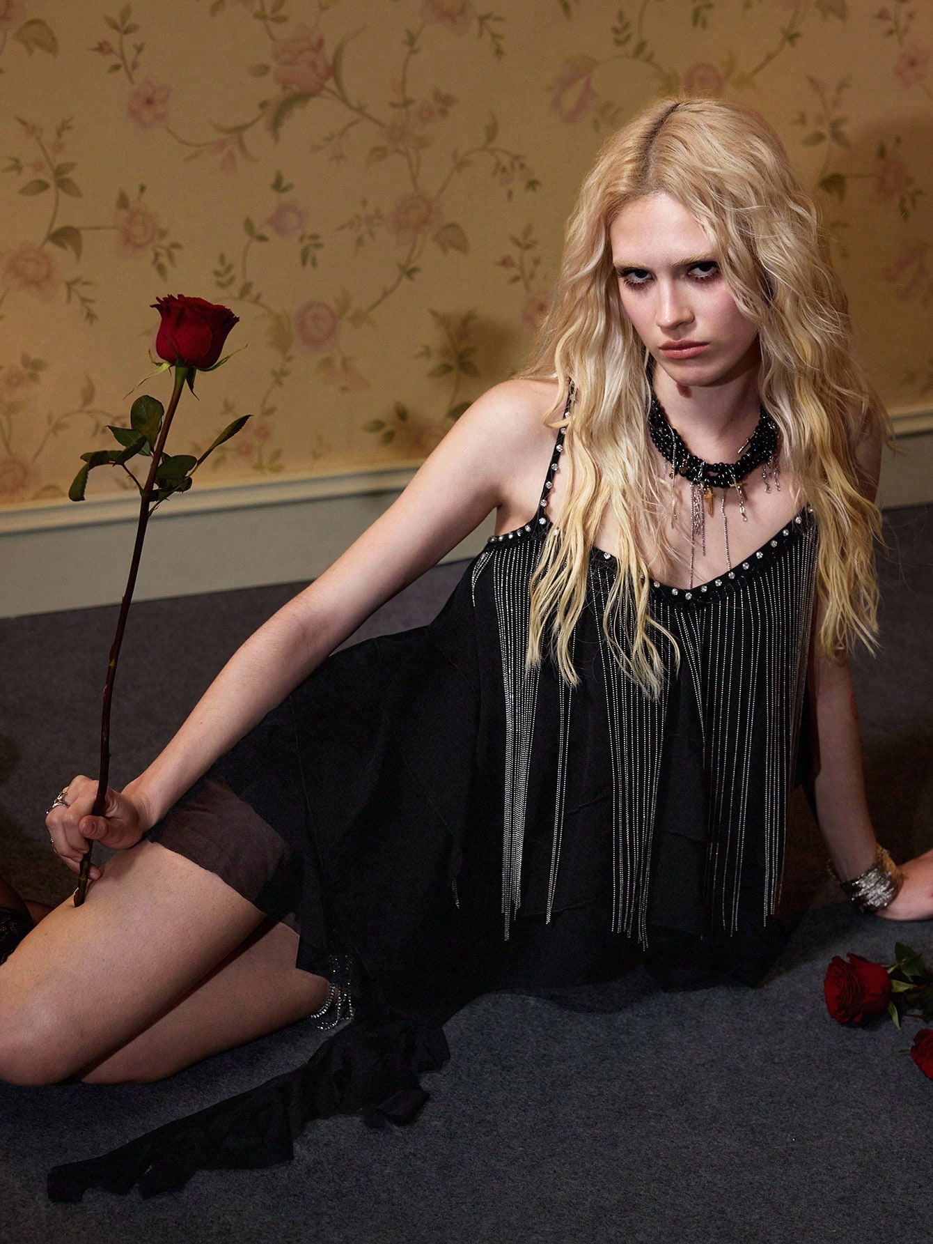 Canotta asimmetrica con orlo morbido, design con catena di perline e paillettes, adatta per festival musicali