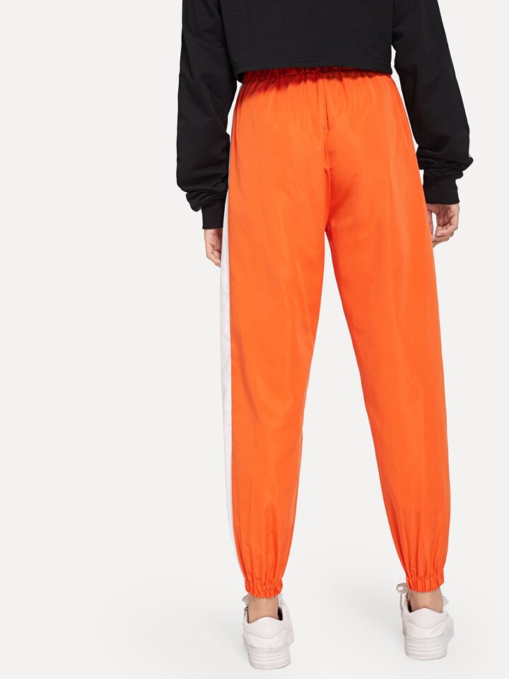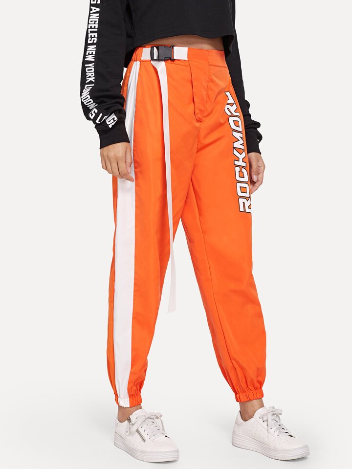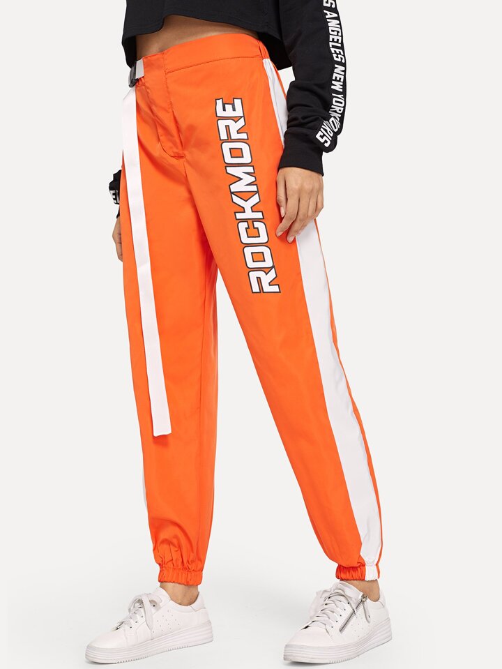 Pantaloni a carota arancione nenon con fibbia e stampa lettera