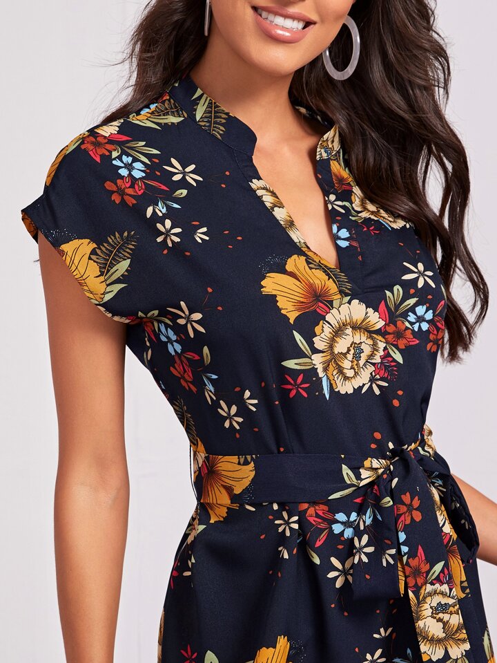 Abito floreale con colletto a revers con cinture e orlo curvo