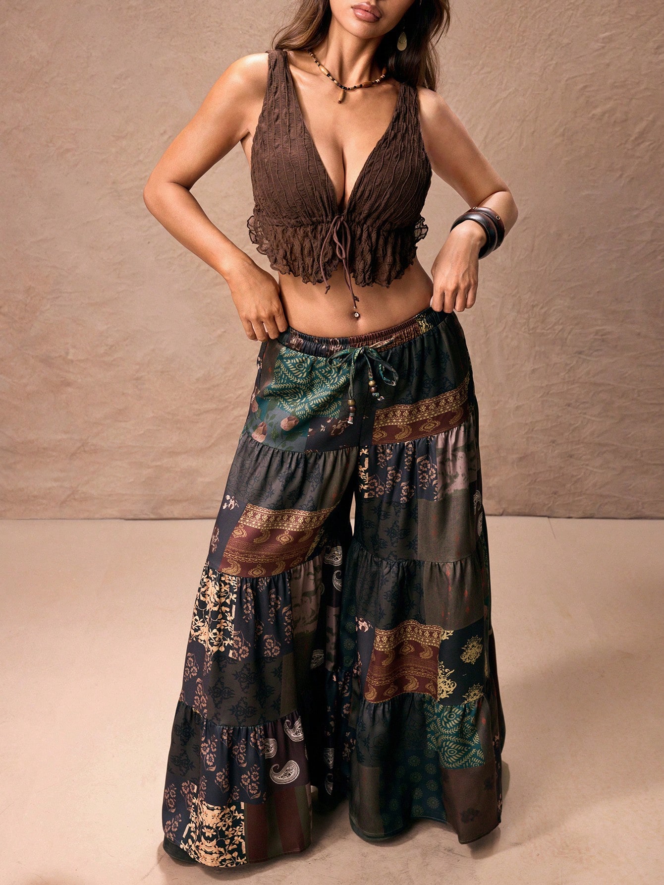 PETITE Pantaloni a zampa d'elefante da donna in stile hippie, con stampa retrò a paisley e quadri, adatti per le vacanze