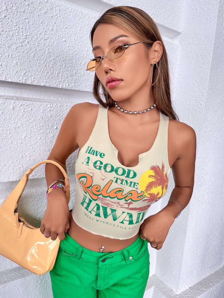 Canotta con scollo a intaglio con grafica di palme e slogan "Have a GOOD TIME, Relax, HAWAII BEST WISHES FOR YOU"