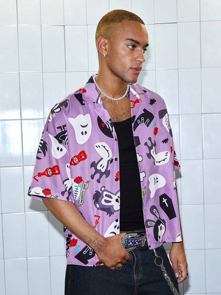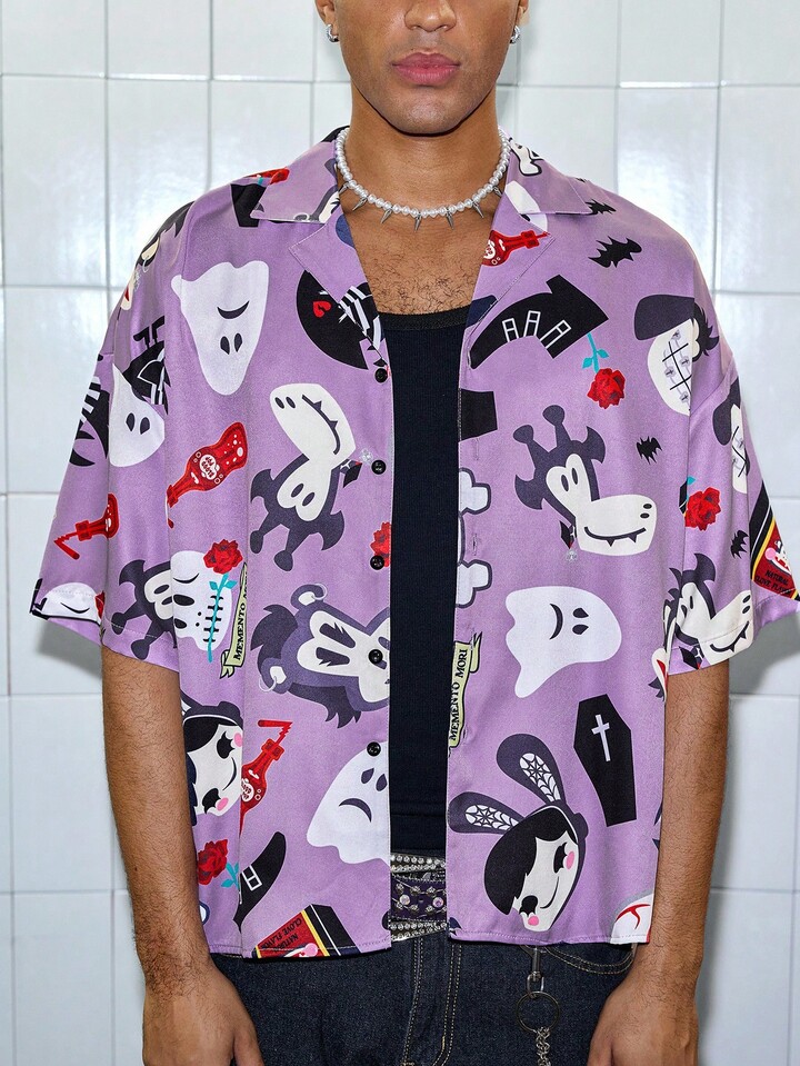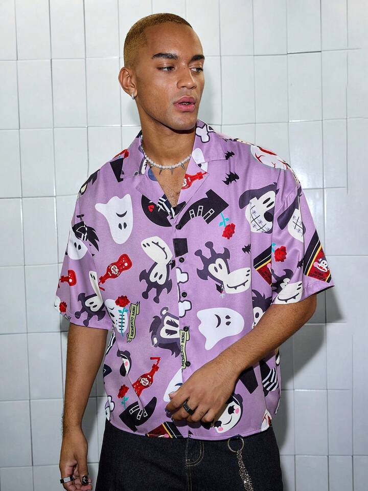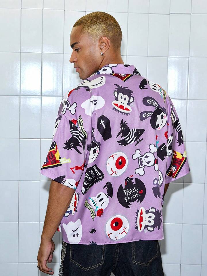 Paul Frank X ROMWE Camicia casual da uomo a maniche corte con bottoni e motivo a cartoni animati, estiva