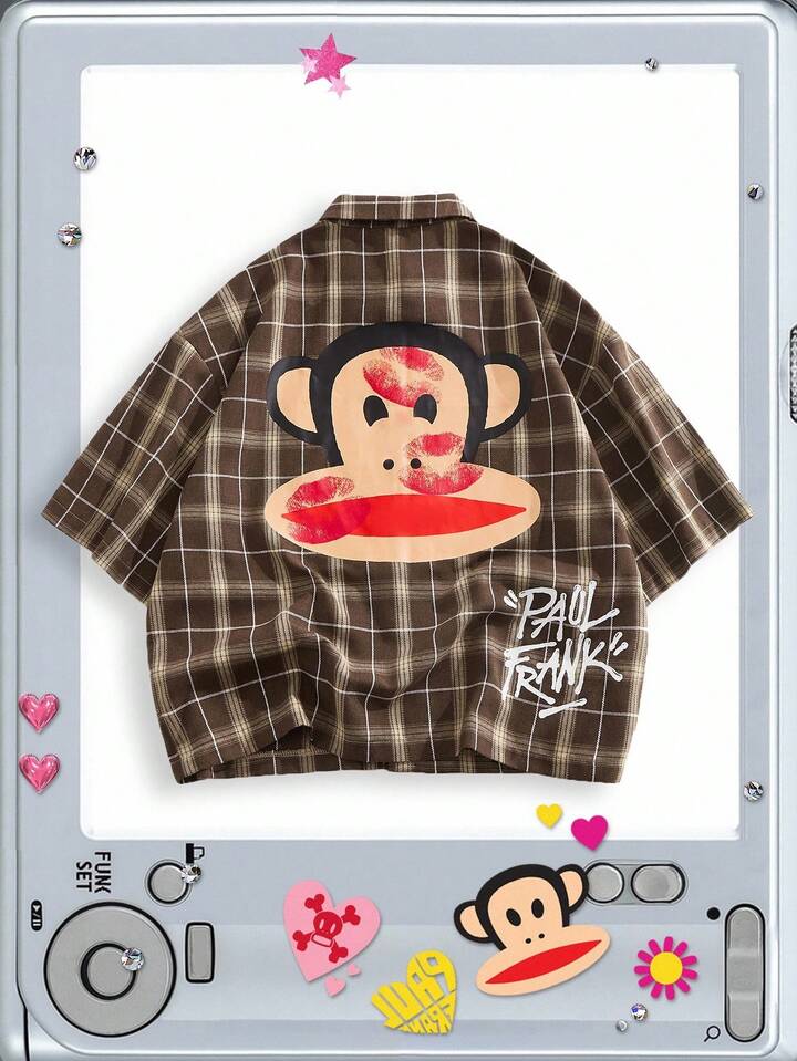 Paul Frank X ROMWE Camicia casual da uomo con vestibilità ampia, stampa di lettere, cartoni animati e plaid, spalle cadenti, stile di moda da strada per l'estate