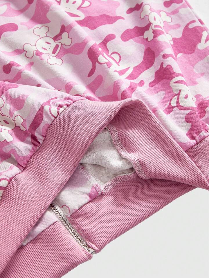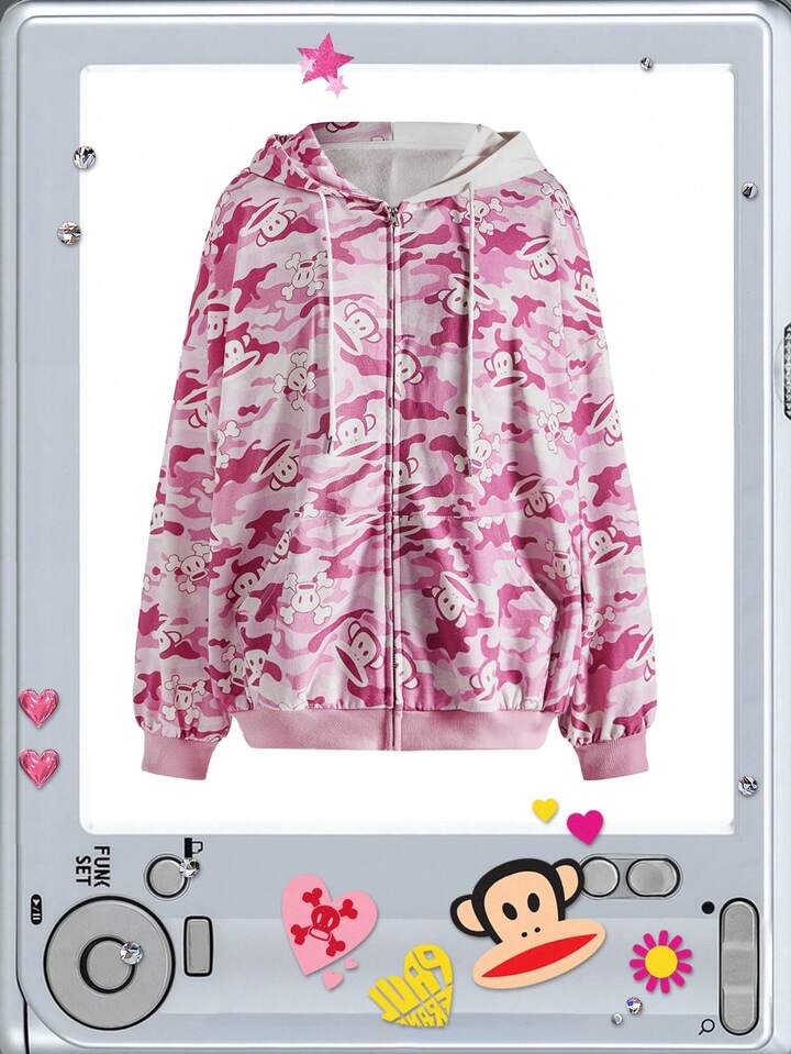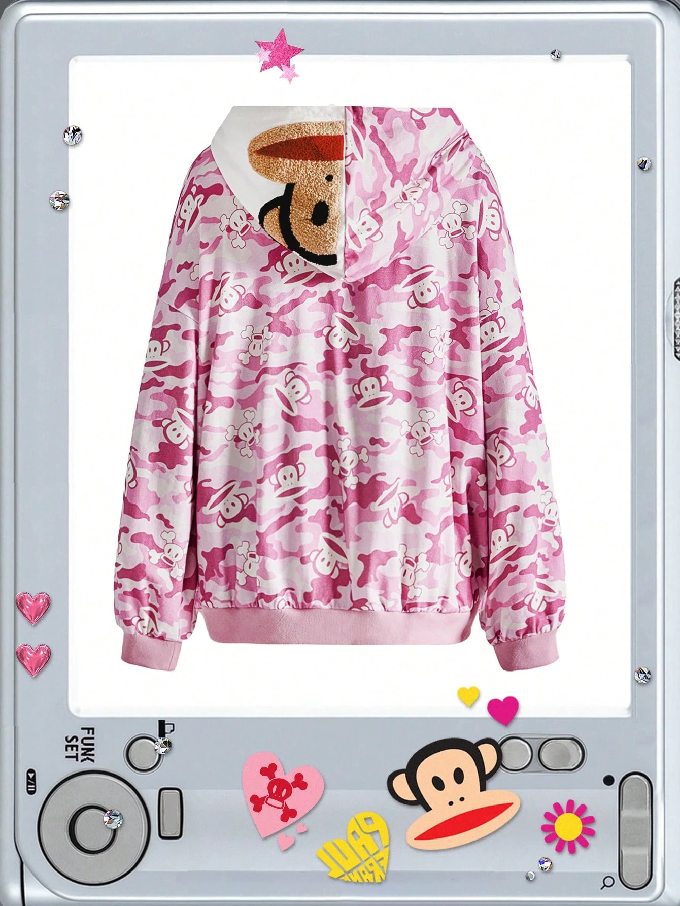 Paul Frank X ROMWE Felpa con cappuccio oversize con stampa mimetica a contrasto di scimmia, stile Y2K, Kpop, Baddie, Streetwear