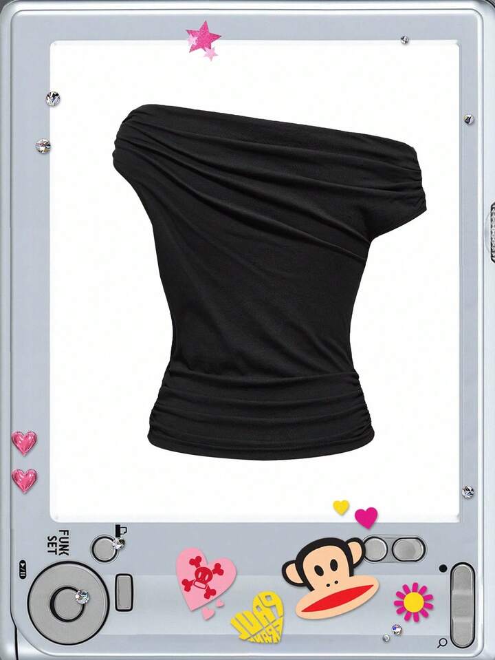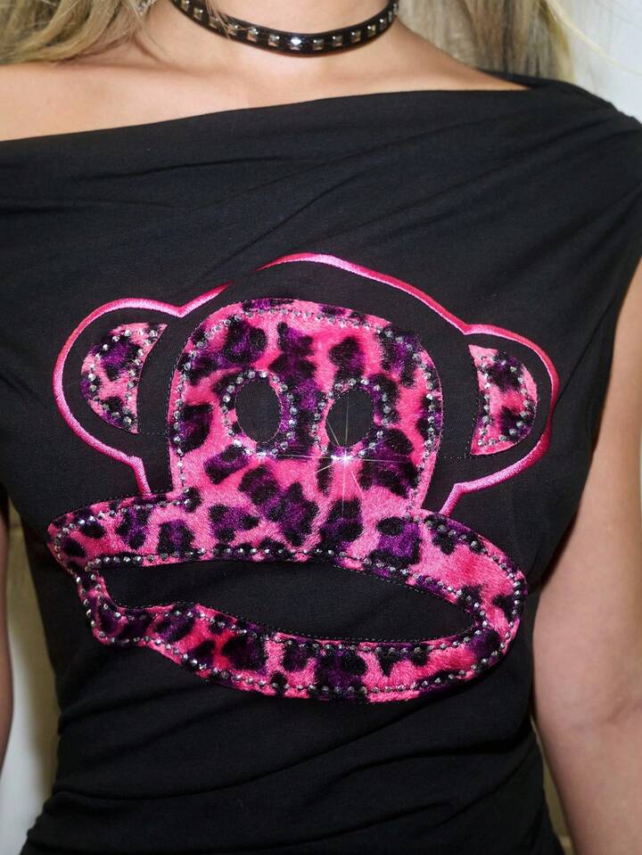 Paul Frank X ROMWE Scollo asimmetrico sexy da donna, con motivo a logo e motivo pipistrello, a T