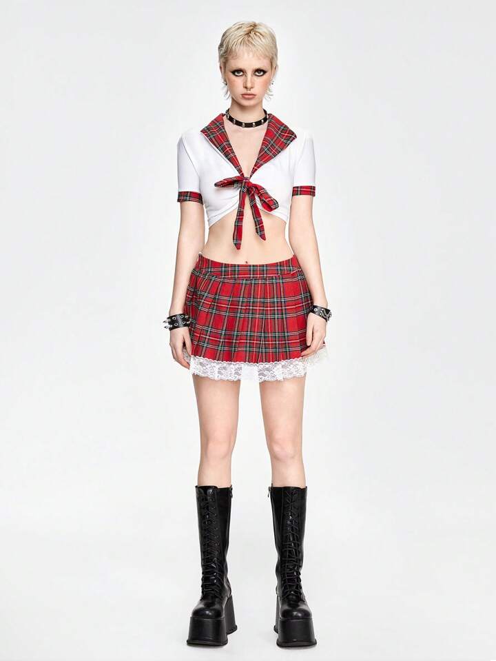 Set Da 2 Pezzi Donna Con Top Corto A Quadretti Con Dettaglio A Nodo E Gonna Plissettata A Linea Di Contrasto