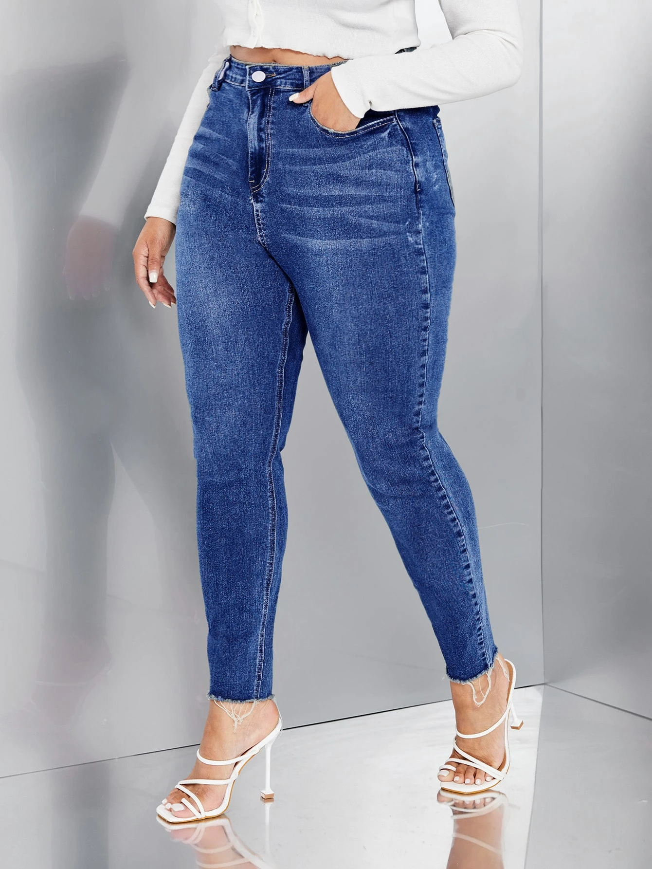 taglie forti Jeans skinny baffo di gatto lavato orlo grezzo