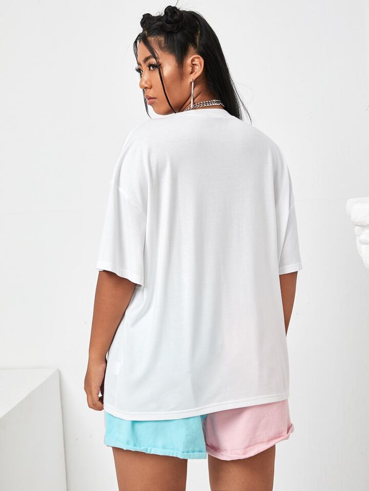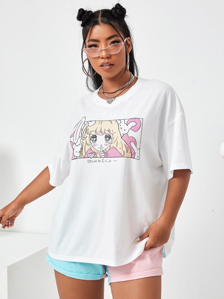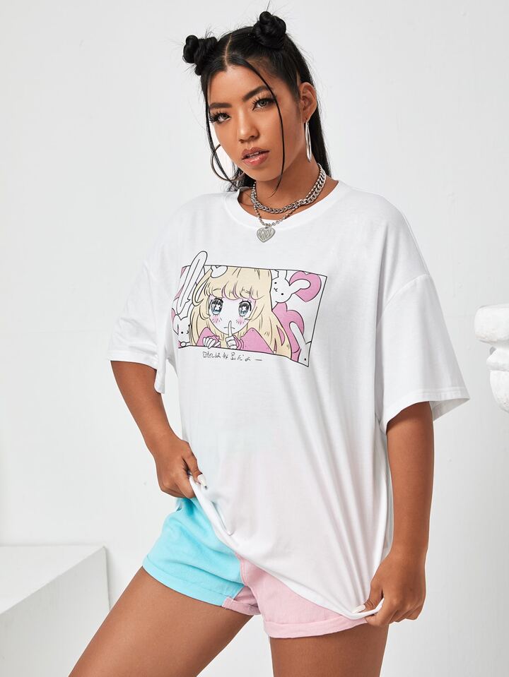 Maglietta con grafica di lettere giapponesi e figura con spalle cadenti