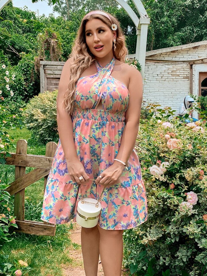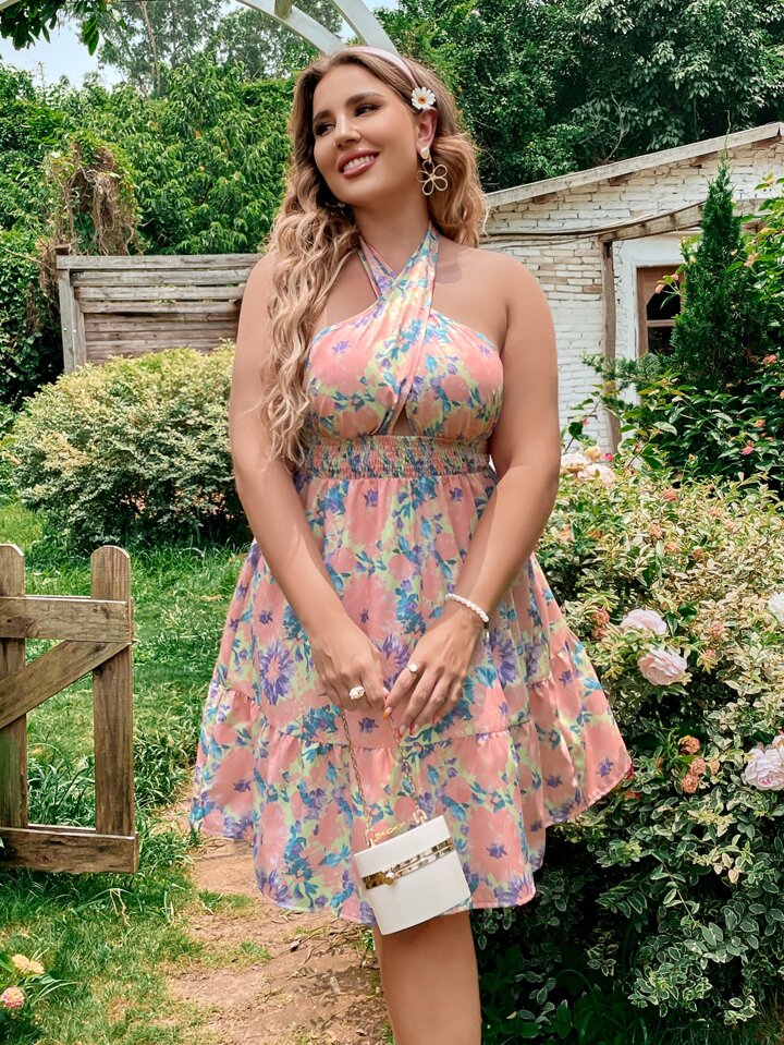 taglie forti Abito halter con stampa floreale vita arricciata con volant capestro