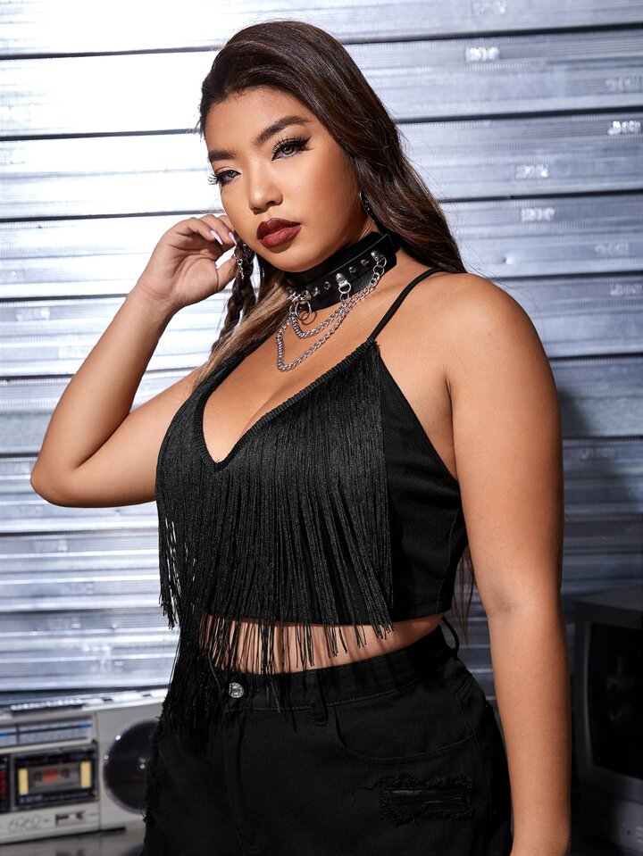 taglie forti Top corto con bretelle sottile con frange
