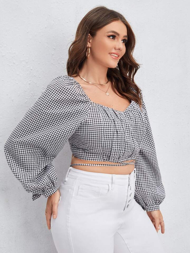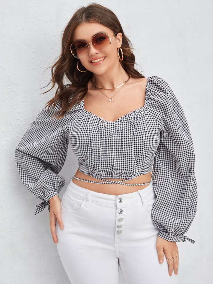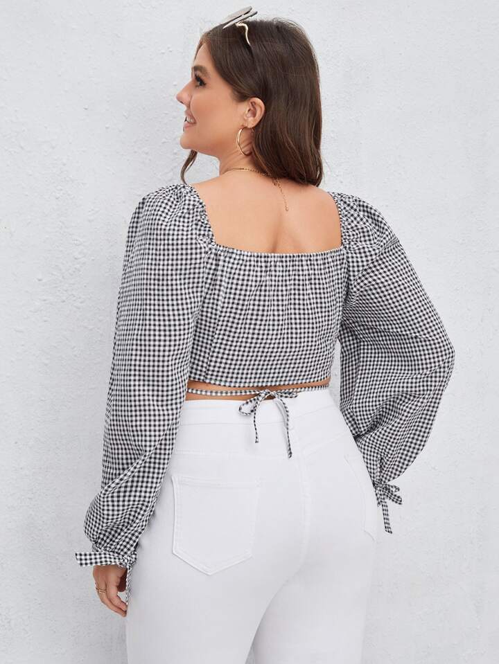 taglie forti Camicetta corta a quadretti incrociato con nodo dietro