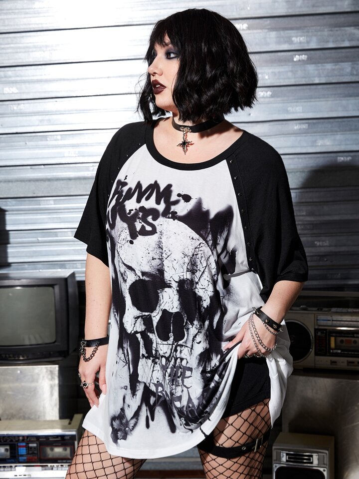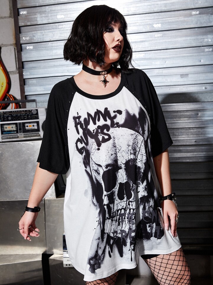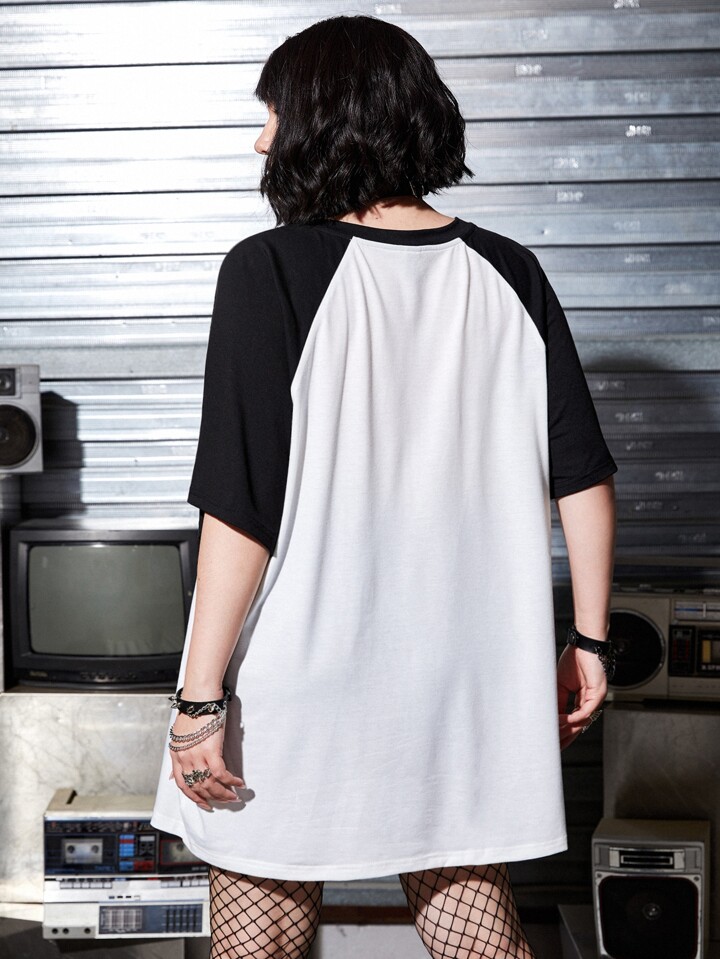 T-shirt con maniche a raglan, con stampa di lettere e teschi extra large, adatta per la scuola e l'estate