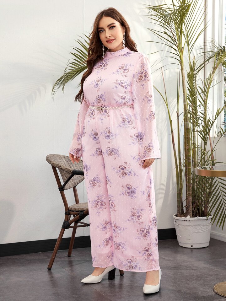 Tuta con collo dritto in maglia a pois chiffon con stampa floreale senza cinture