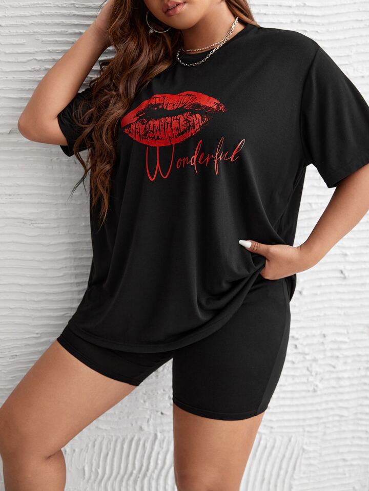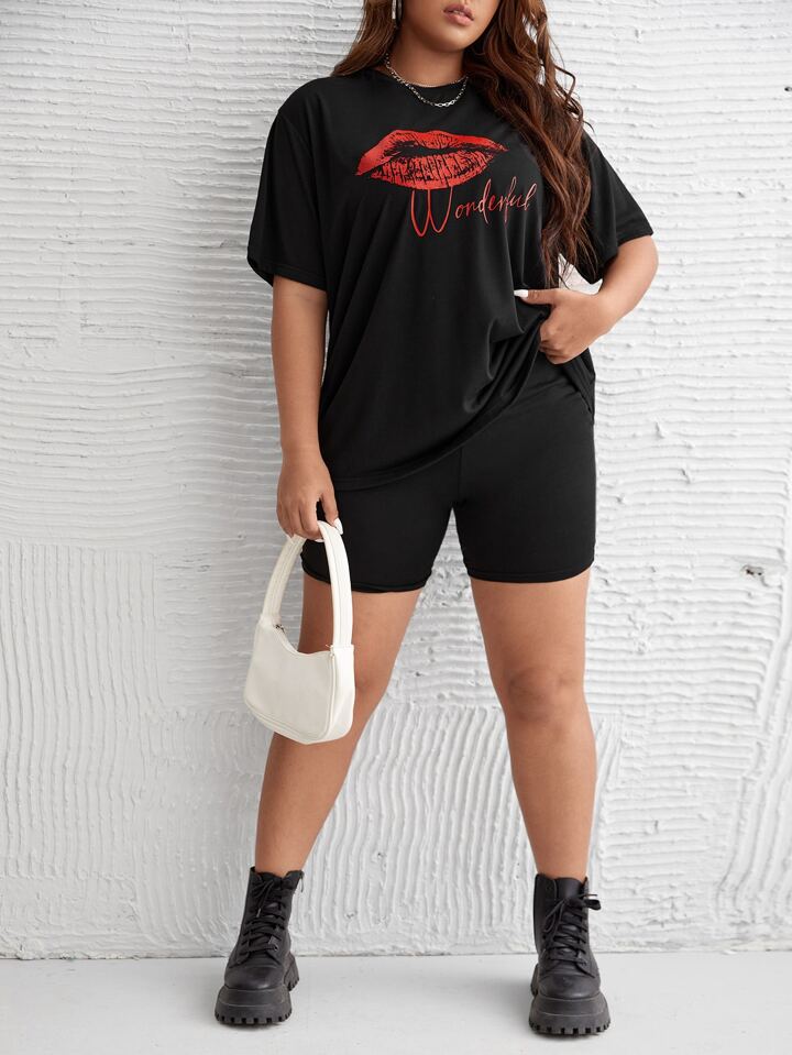 taglie forti con stampa della bocca Pantaloncini da motociclista e Maglietta Set pigiama