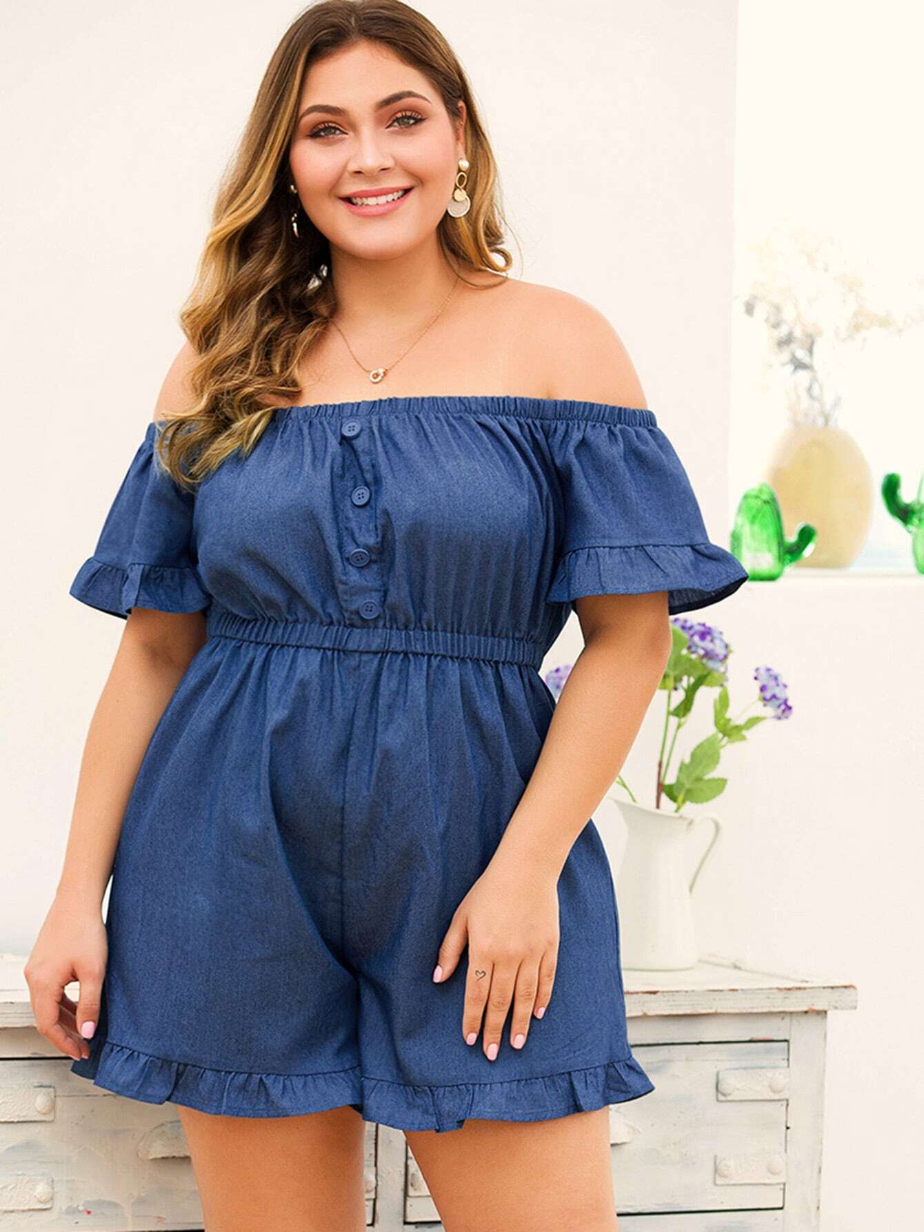Tuta in denim con bordo a volant e spalle scoperte grandi dimensioni