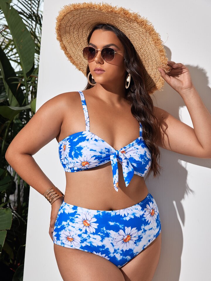 Bikini con nodo anteriore a fantasia floreale e di nuvole per taglie forti, per spiaggia estiva