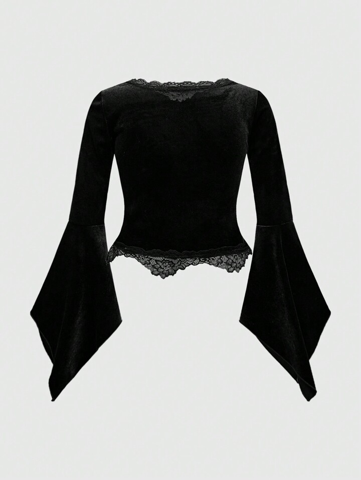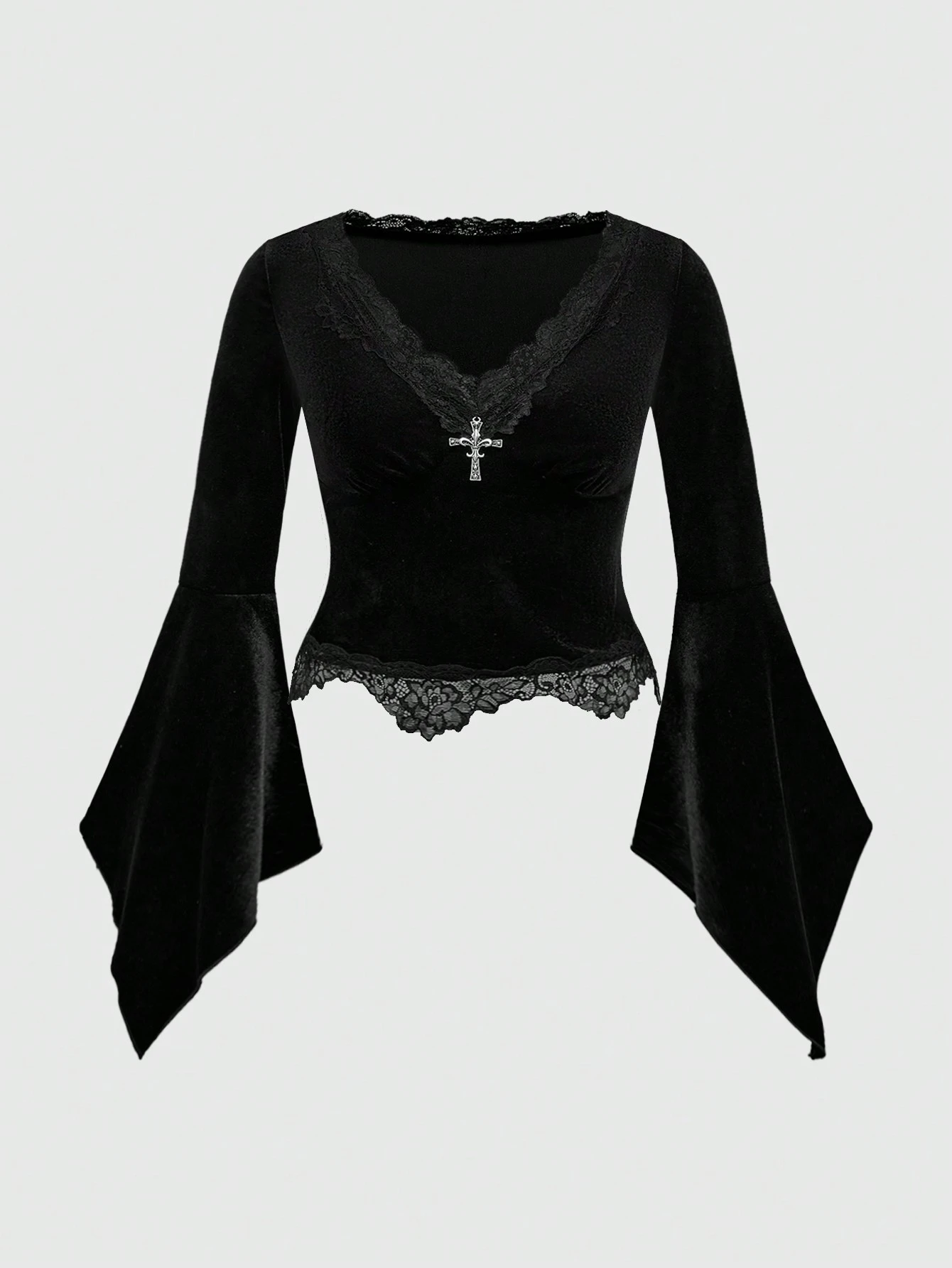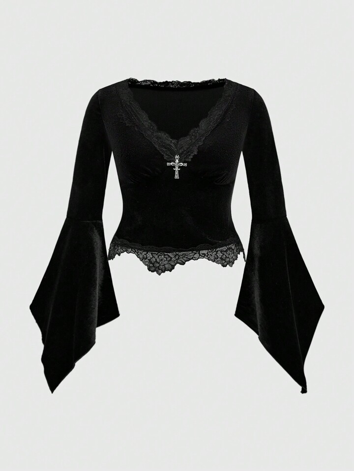 Goth Blusa in velluto e pizzo con scollo a V sexy, con pendente metallico a croce, maniche a sbuffo, taglie comode, stile gotico romantico