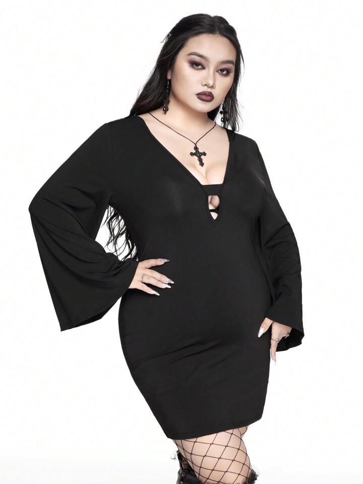 Goth Abito nero taglia forte stile gotico, misterioso ed orrore, sexy con scollo a V profondo, con cappuccio e maniche a sbuffo, alto stretch