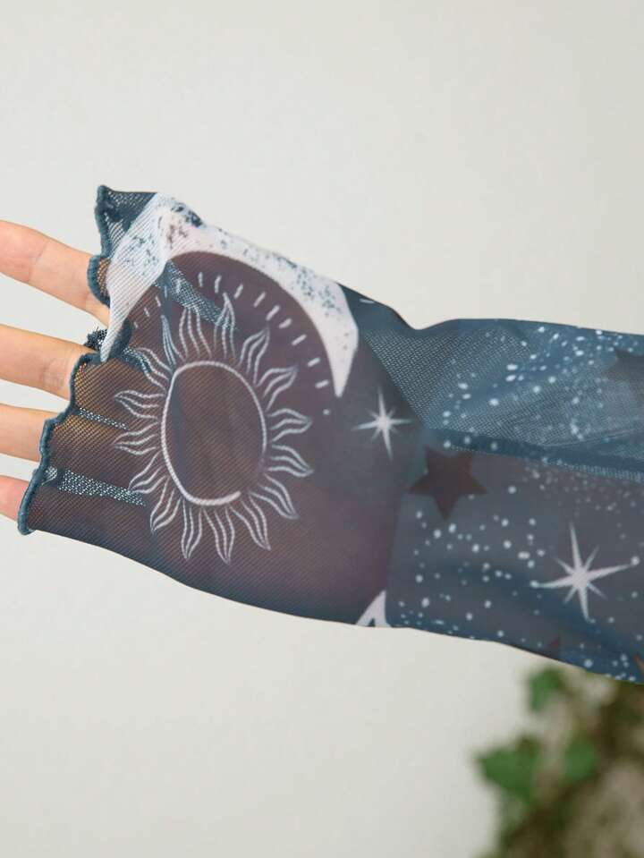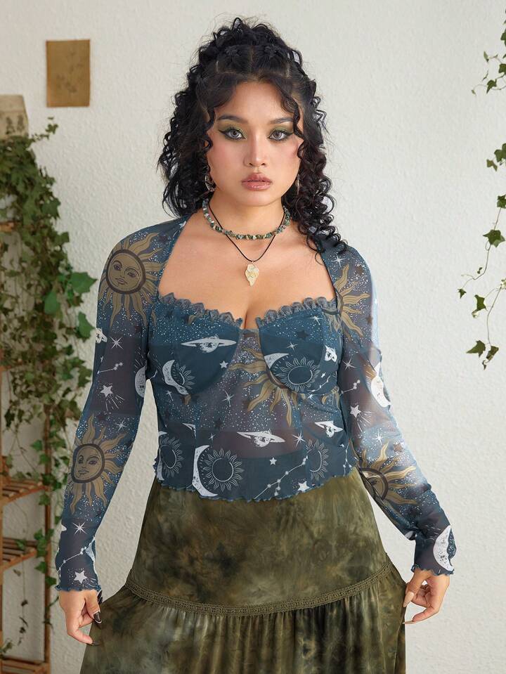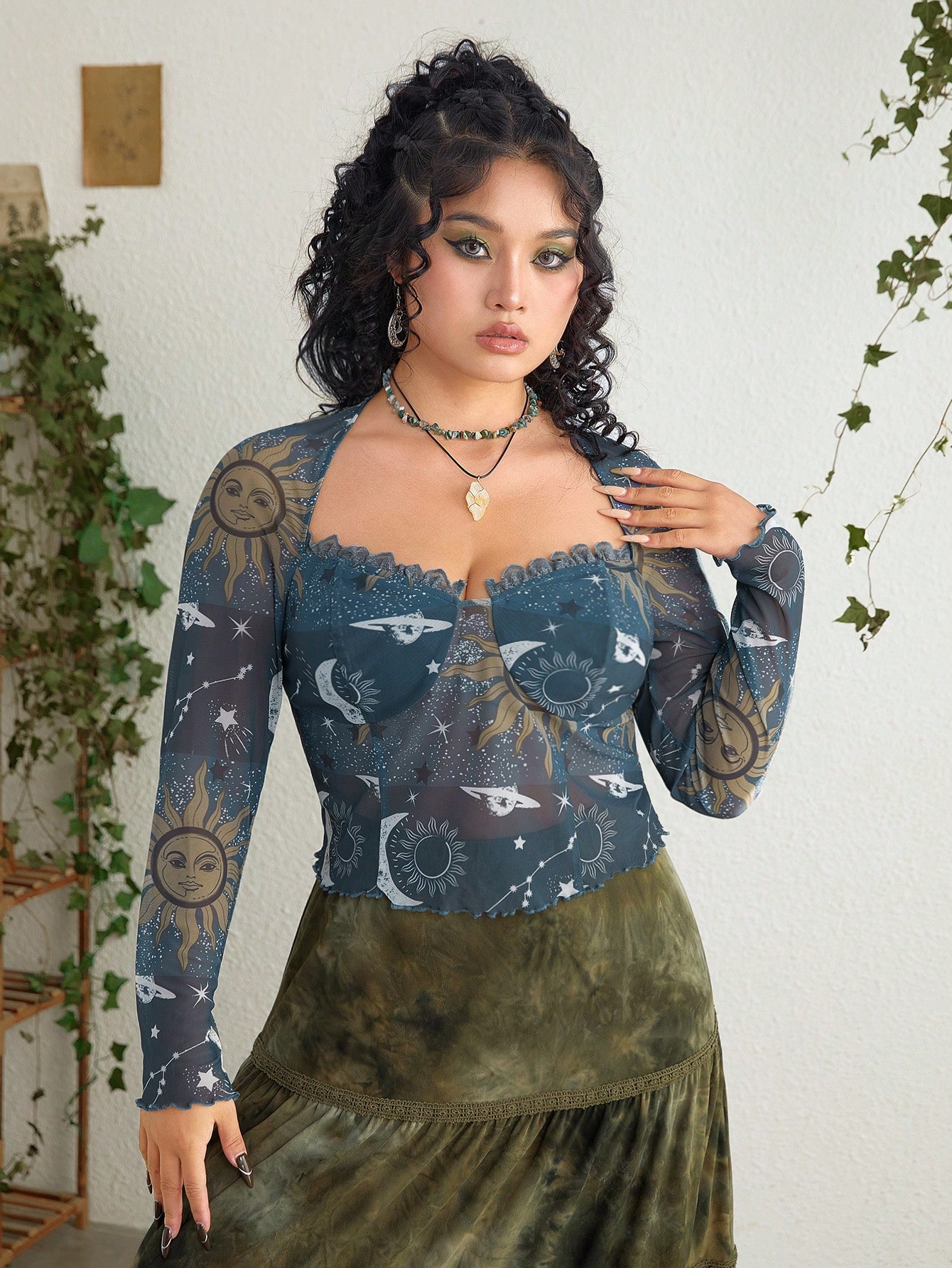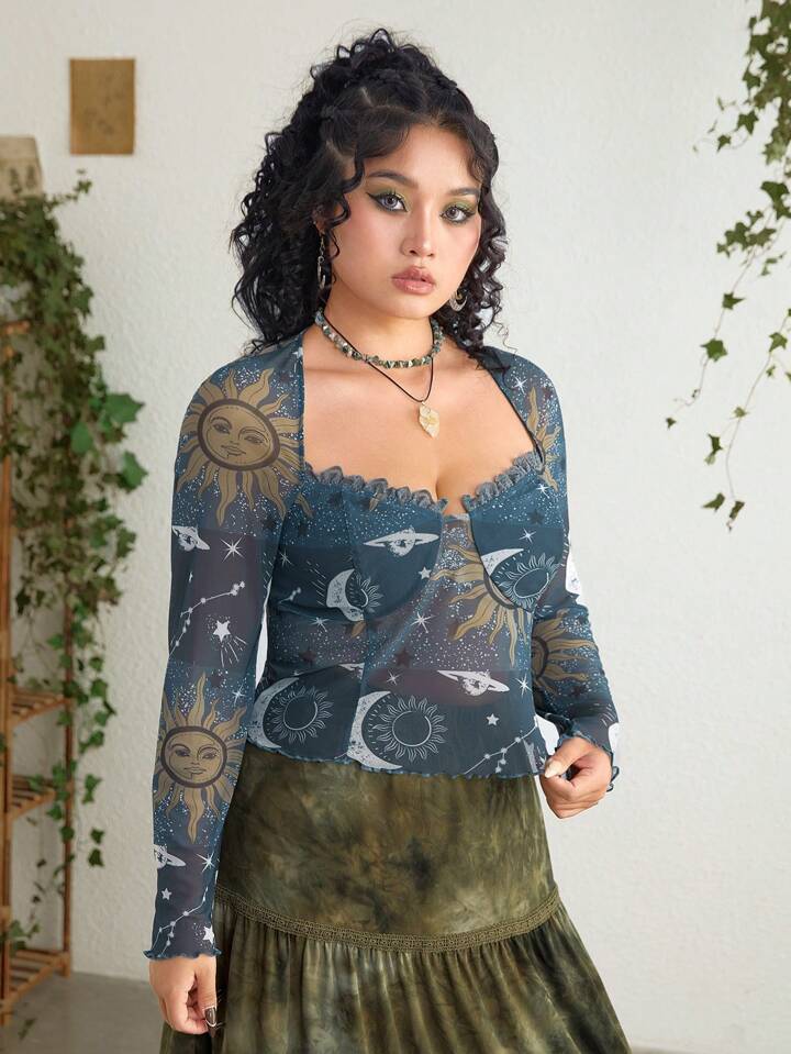 Top Trasparente In Pizzo Taglie Forti Con Patchwork E Motivo Faccia Di Sole