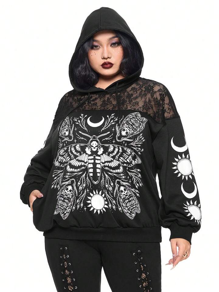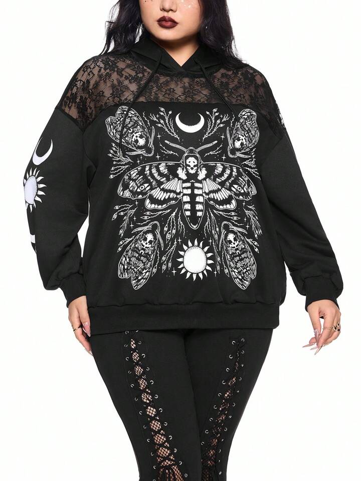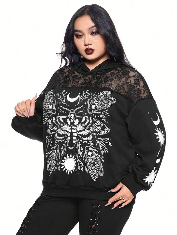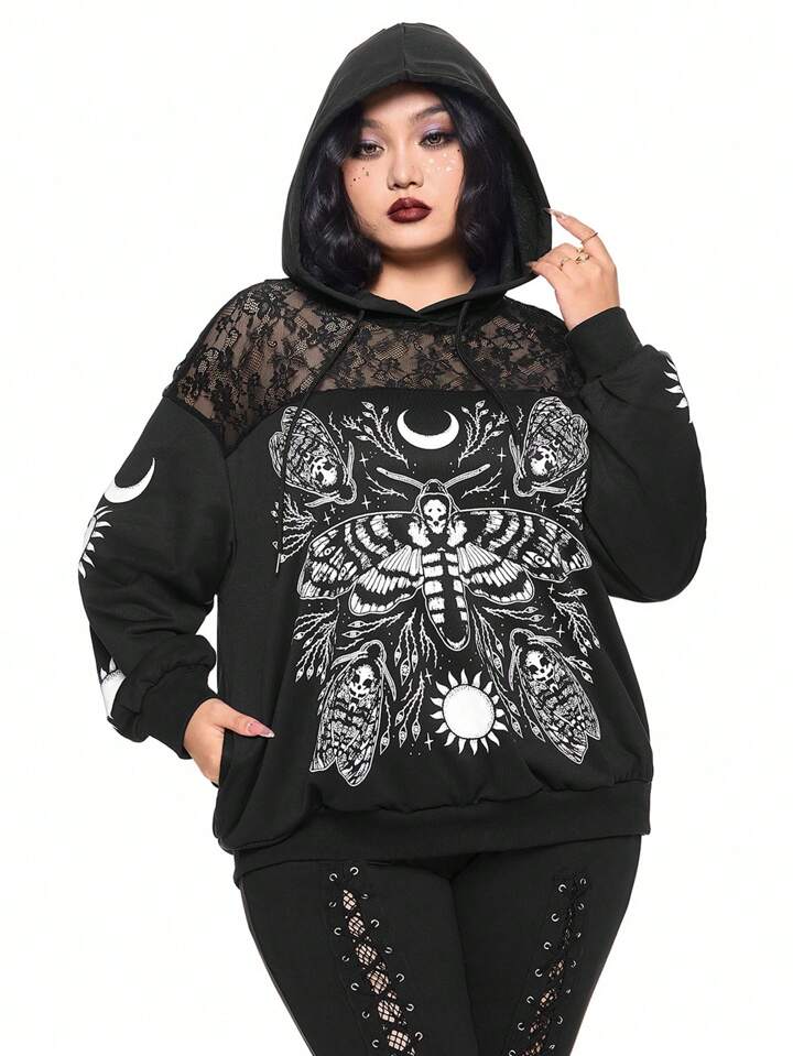 Felpa con cappuccio, modello floreale a falena, contrasto in pizzo, maniche lunghe, taglia curvy per donne
