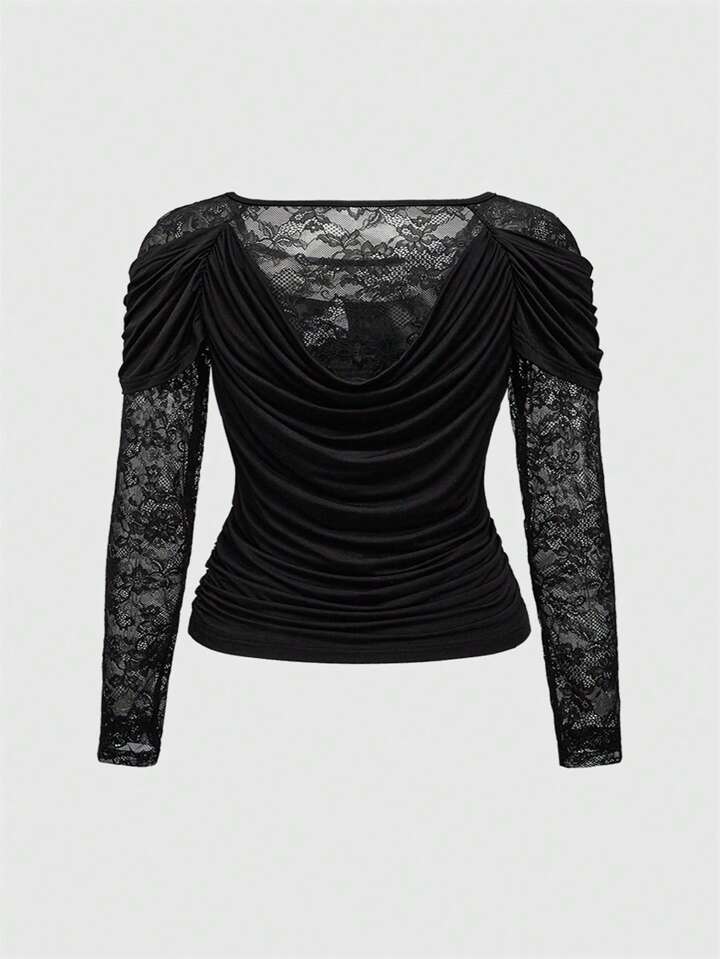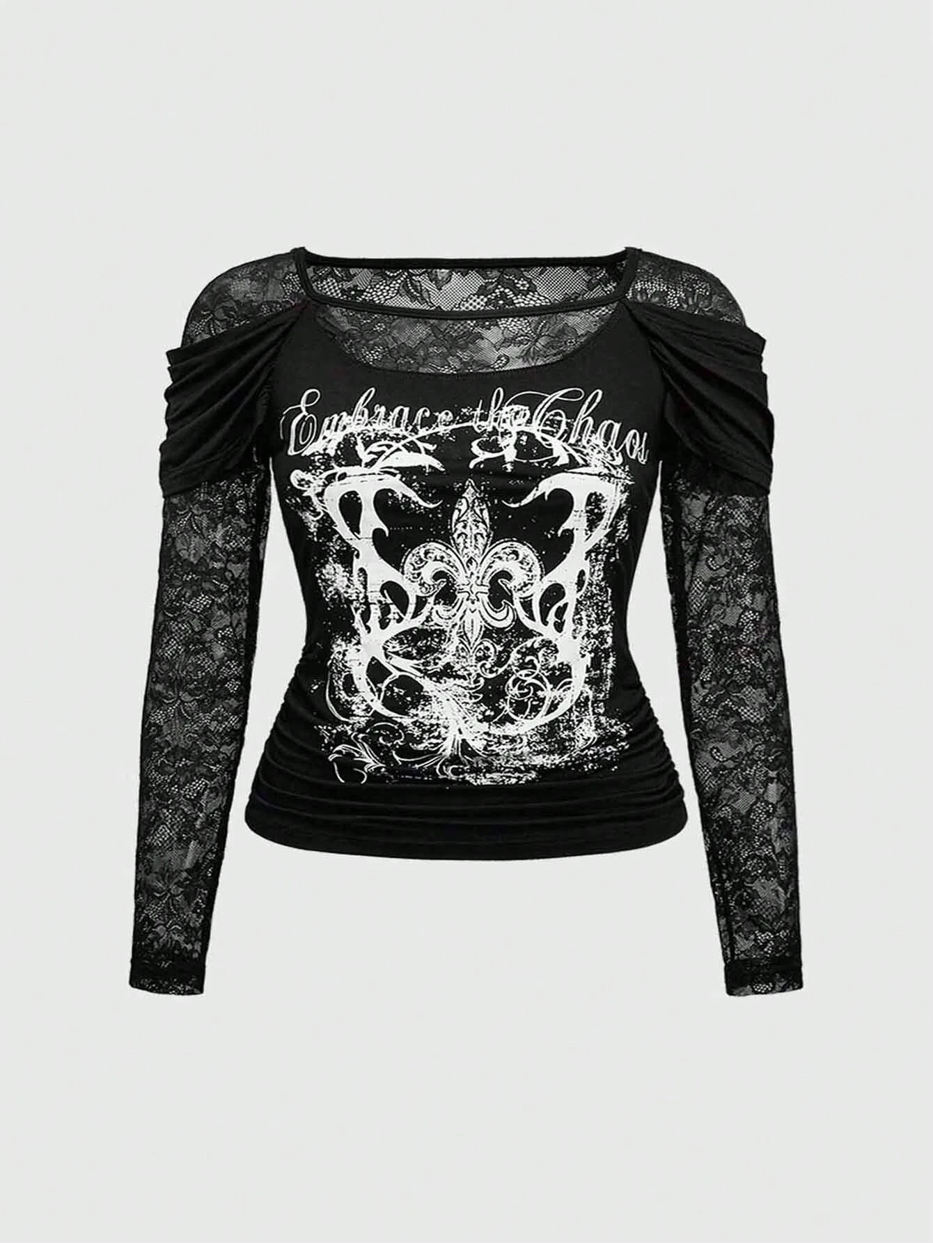 Goth Maglietta aderente da donna taglia comode con stampa gotica grunge a contrasto e pizzo romantico