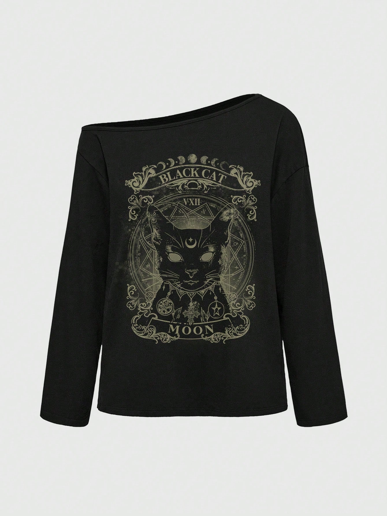 Goth Maglietta a maniche lunghe oversize da donna, stile gotico casual, colore unito, spalla obliqua