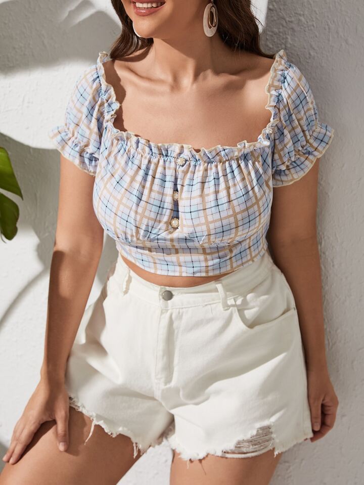 Camicetta corta a quadri con bottone con orlo a volant con scollo quadrato