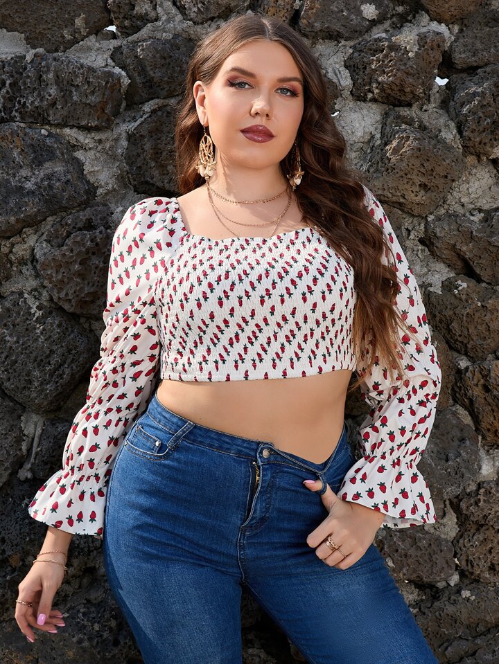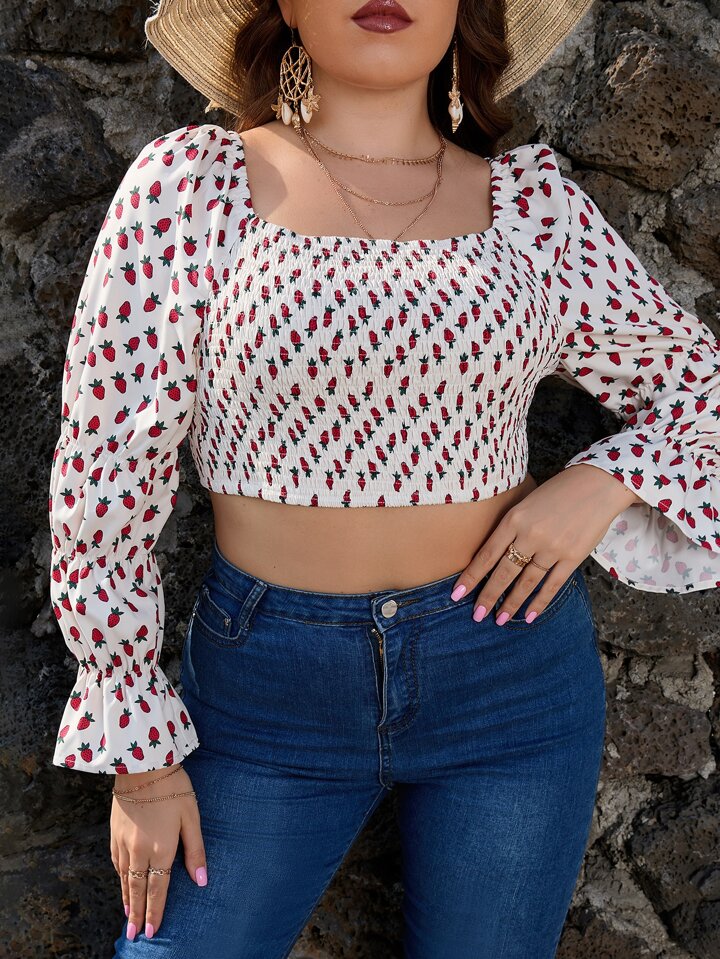 taglie forti Camicetta corta con stampa fragola arricciato manica svasata