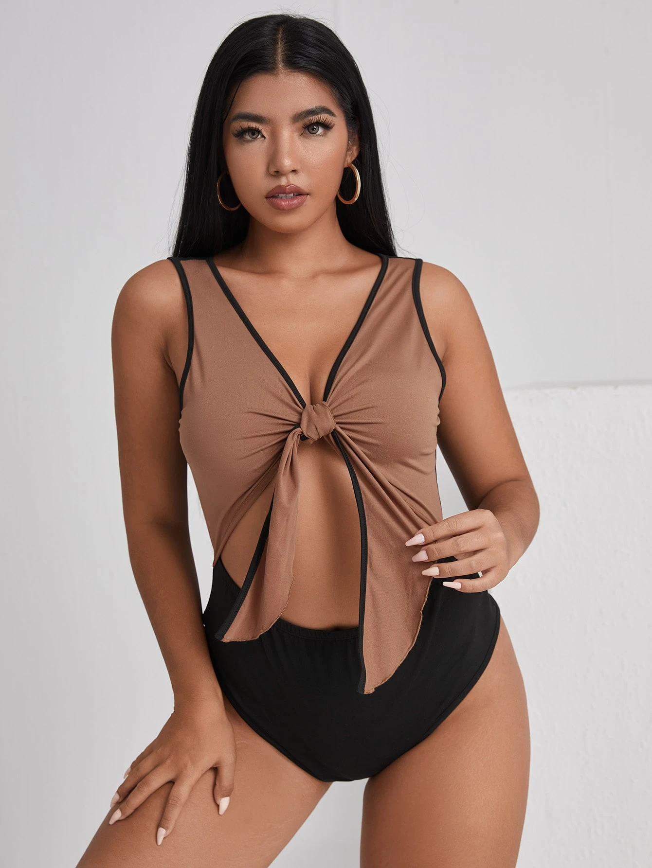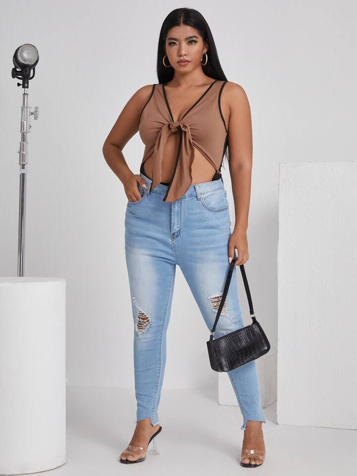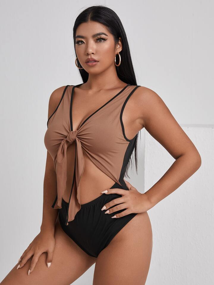 Body con bordo con peekaboo a contrasto con nodo frontale