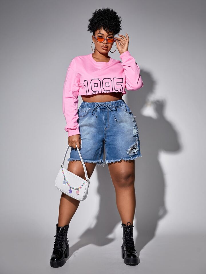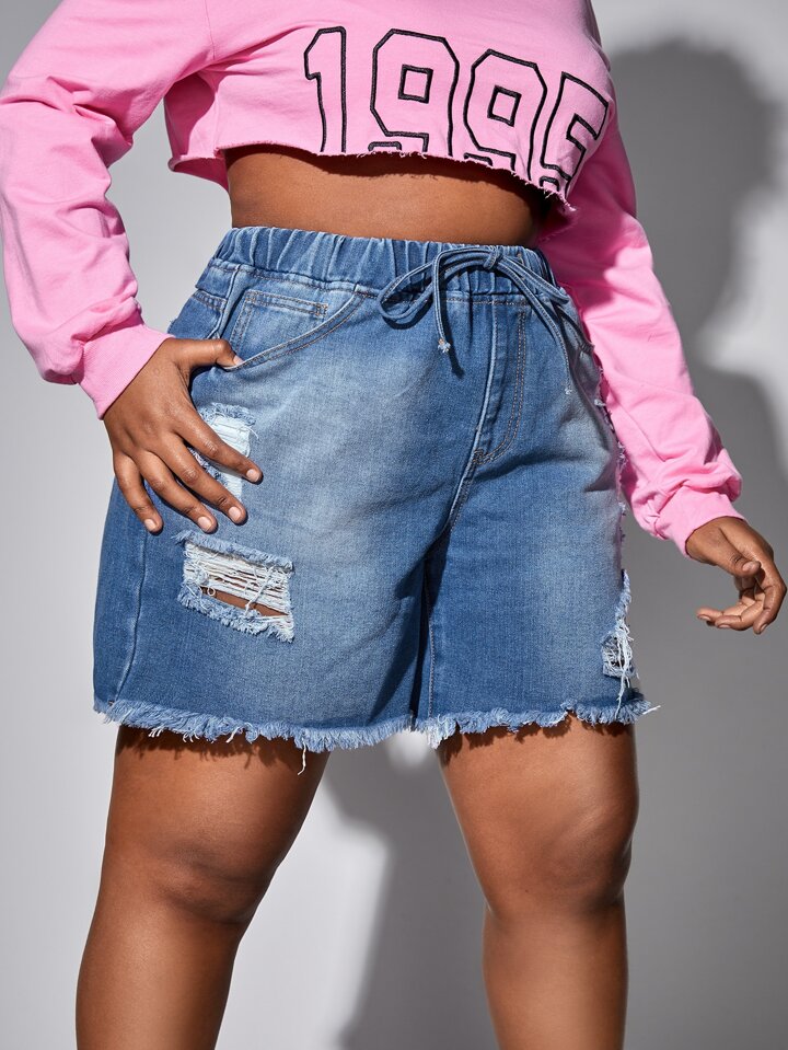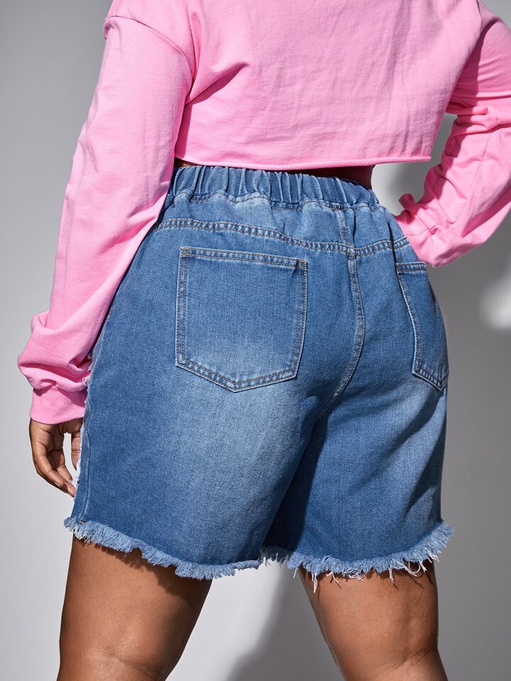 taglie forti Shorts in denim con orlo grezzo strappato fiocco in vita