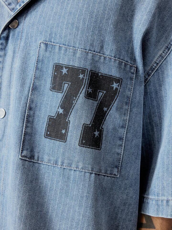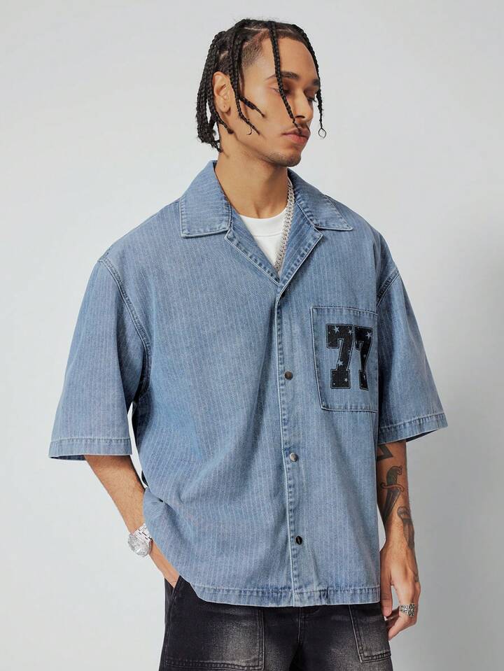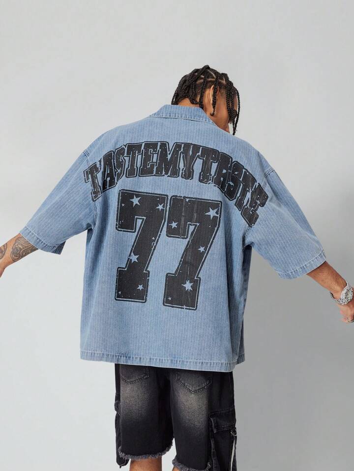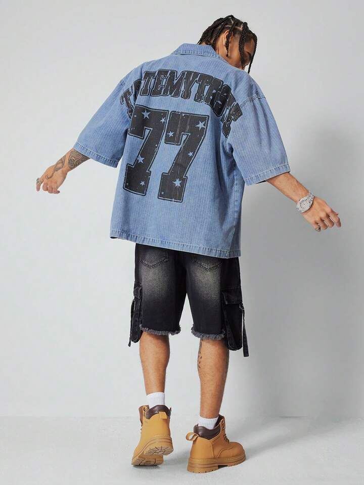 Prep Camicia di jeans da uomo con stampa digitale, maniche corte e taschino, abbottonatura frontale