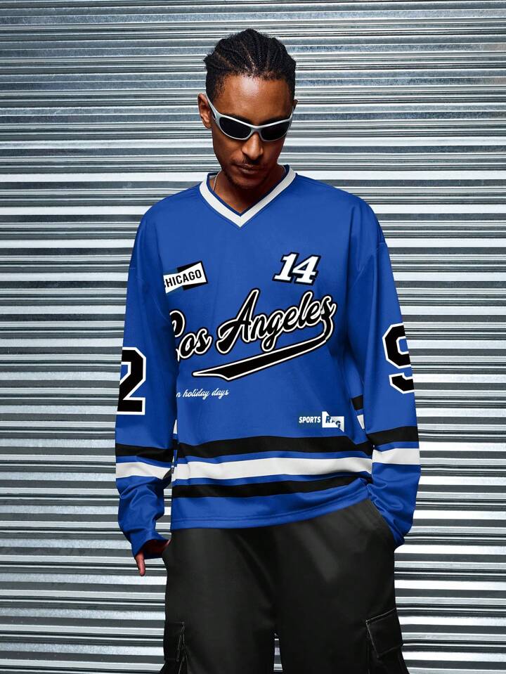 Prep Maglietta casual a maniche lunghe con scollo a V da uomo, con stampa di lettere e righe, autunnale