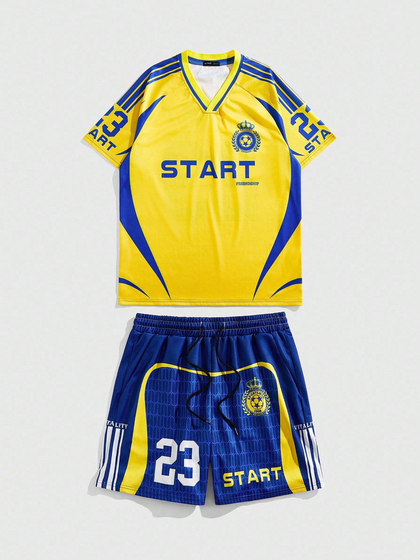 Prep Set casual da uomo di maglietta a maniche corte con scollo a V e stampa di lettere, e pantaloncini, abbigliamento sportivo