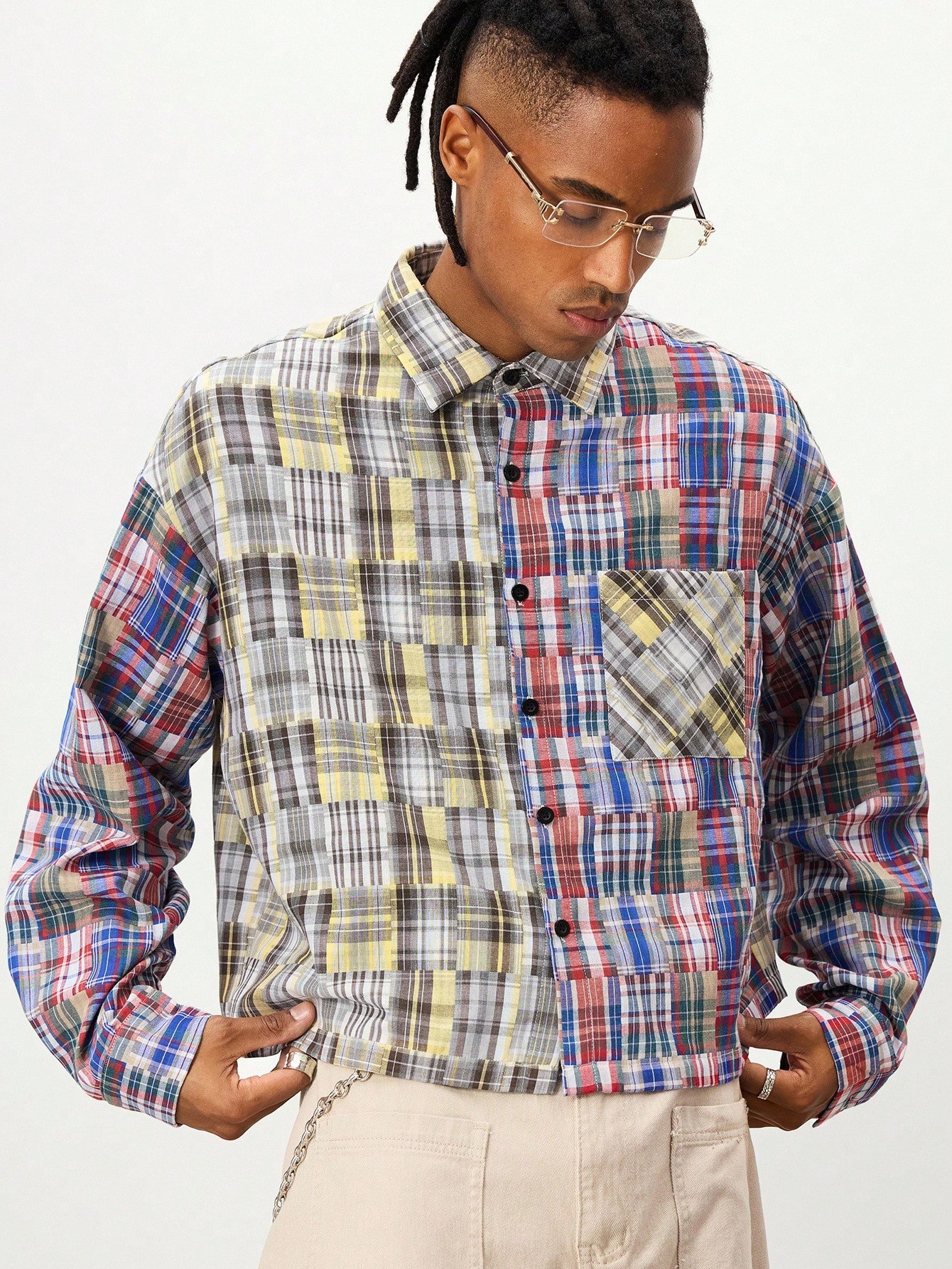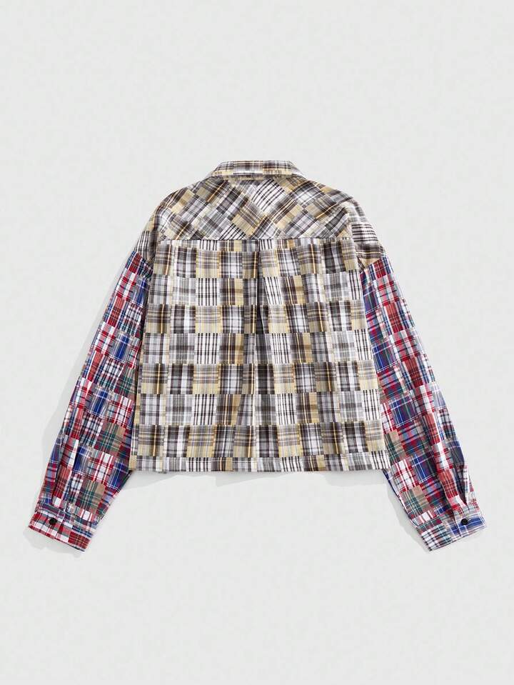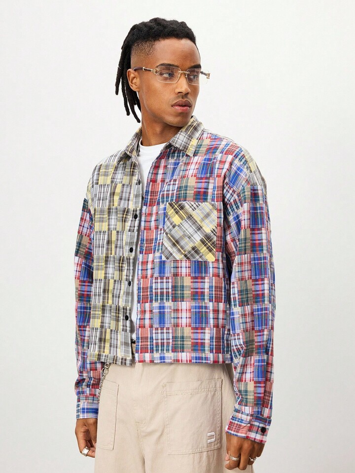 Prep Camicia casual da uomo a maniche lunghe con motivo a quadri, monopetto, con tasche, allentata, con bottoni