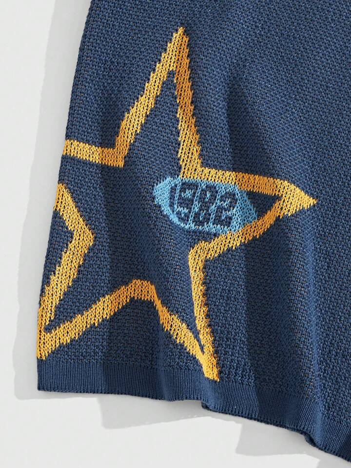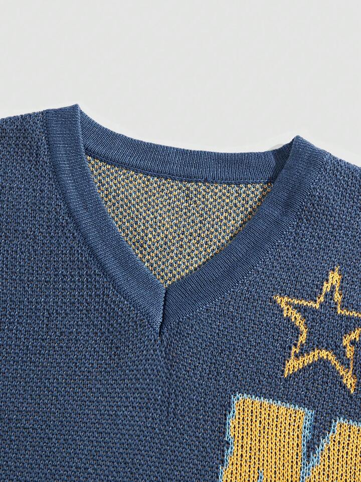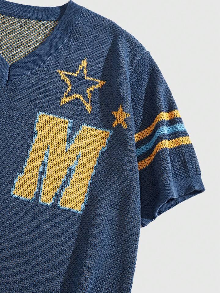 Prep Maglione a maglia casual a collo a V con strisce a contrasto jacquard a stella e lettere per la primavera/estate da uomo