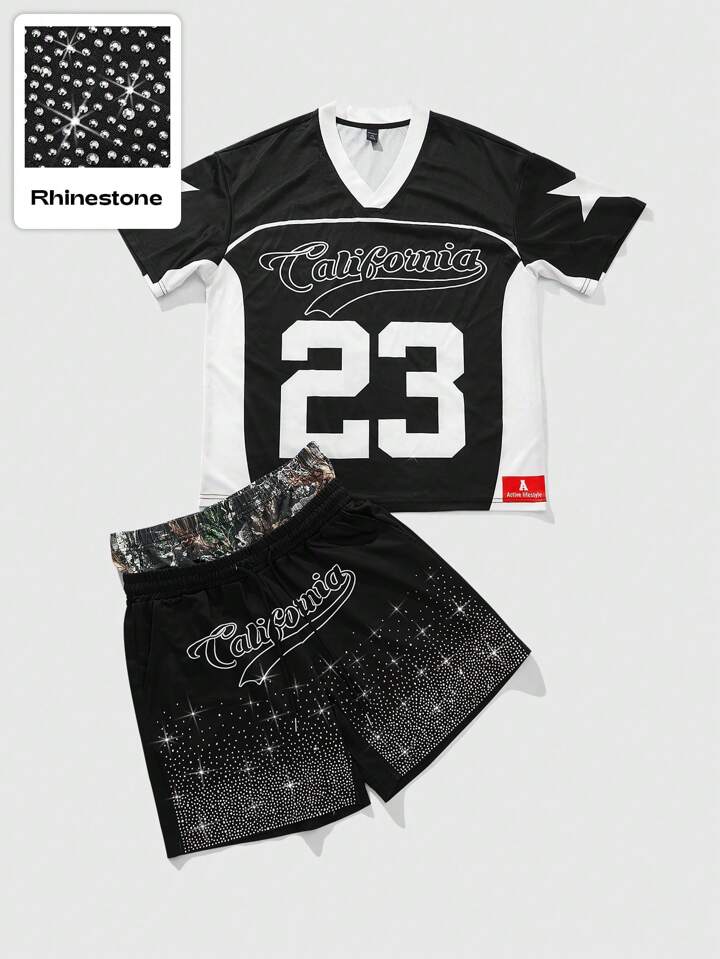 Prep Set di magliette da uomo, design americano da strada, stile sportivo, pantaloncini con vita a doppia fascia e strass a forma di ramo d'albero