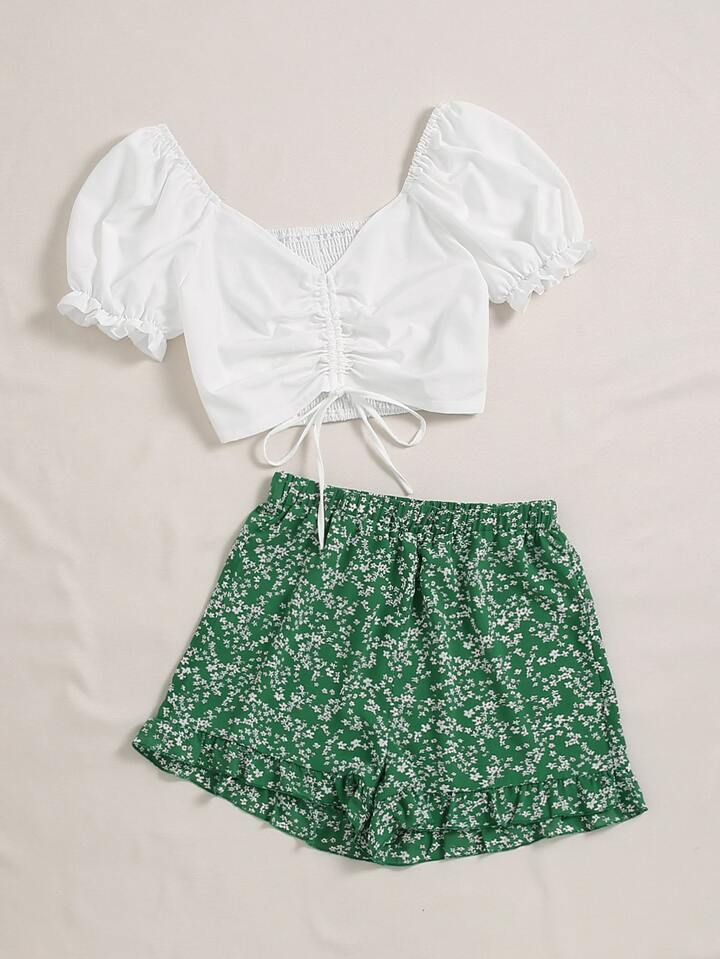 Top con manica a sbuffo arricciato con coulisse frontale e Shorts fiorellini con orlo arricciato