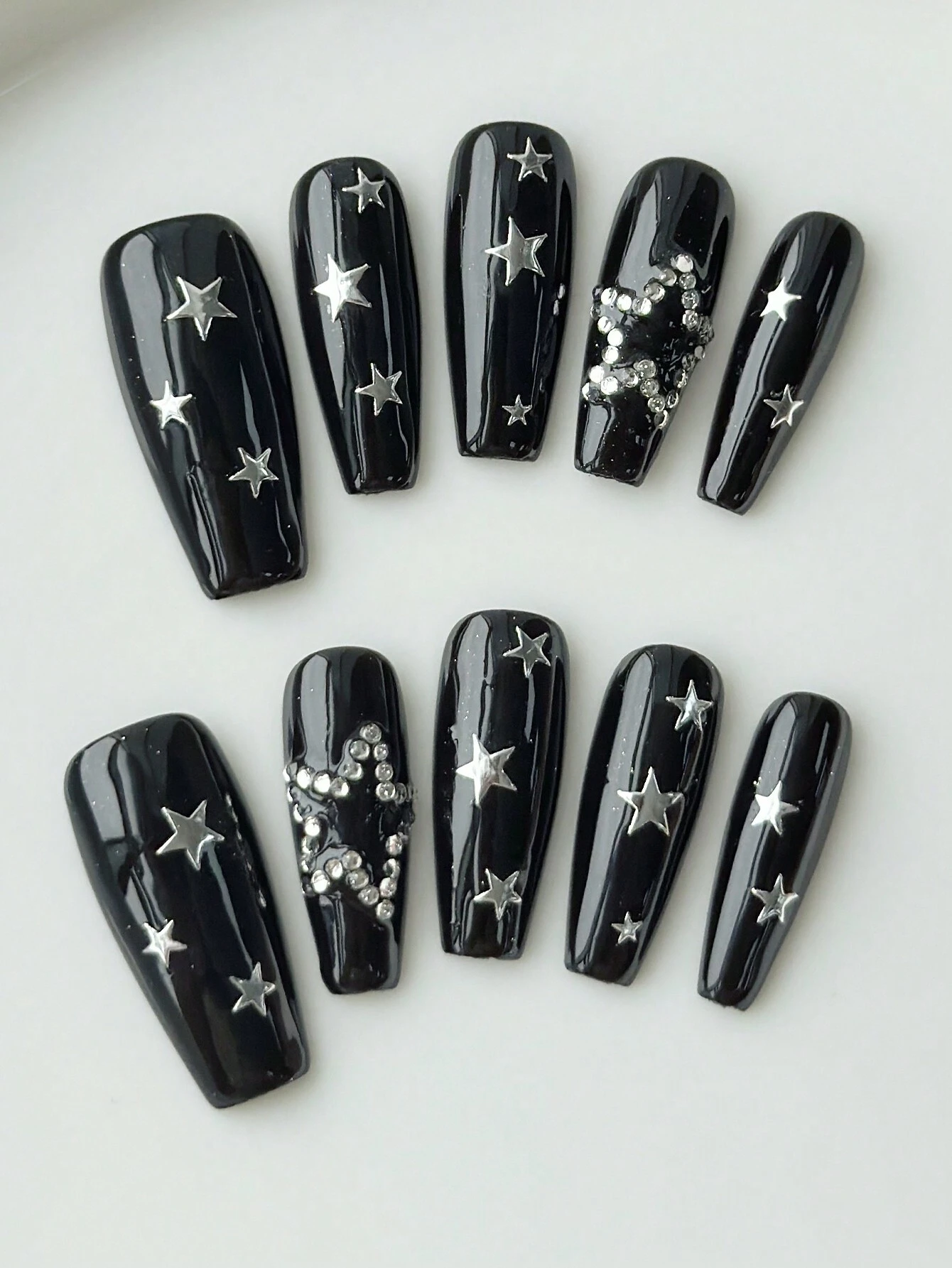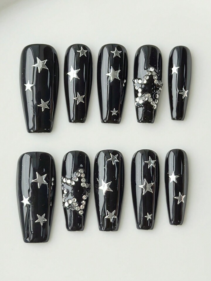 ROMWE Avant 10 pezzi Unghie finte fatte a mano di alta qualità in stile Y2K Gothic Punk con motivo di stelle scure + 3 pezzi Nastro biadesivo, decorazione rimovibile con glitter, adesivi per unghie dipinti a mano adatti per feste, festival, danza e l'uso quotidiano.