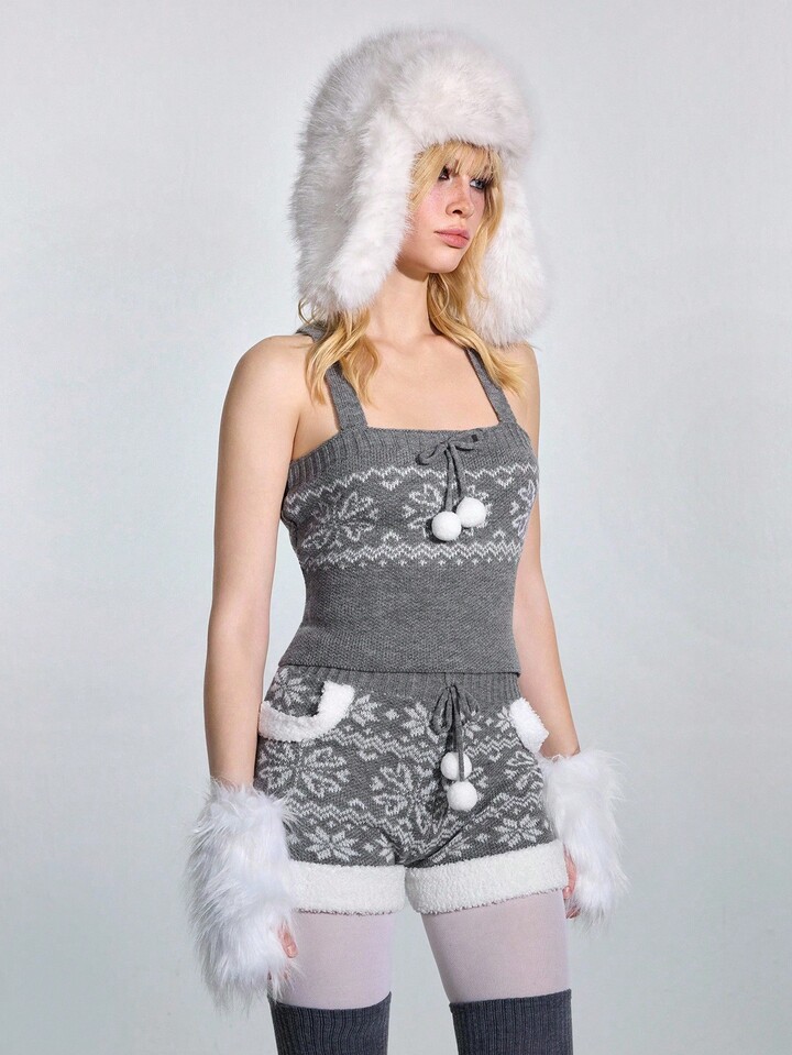ROMWE Avant 2 pezzi Set di top a canottiera con fiocco di neve e pantaloncini lavorati a maglia per donna